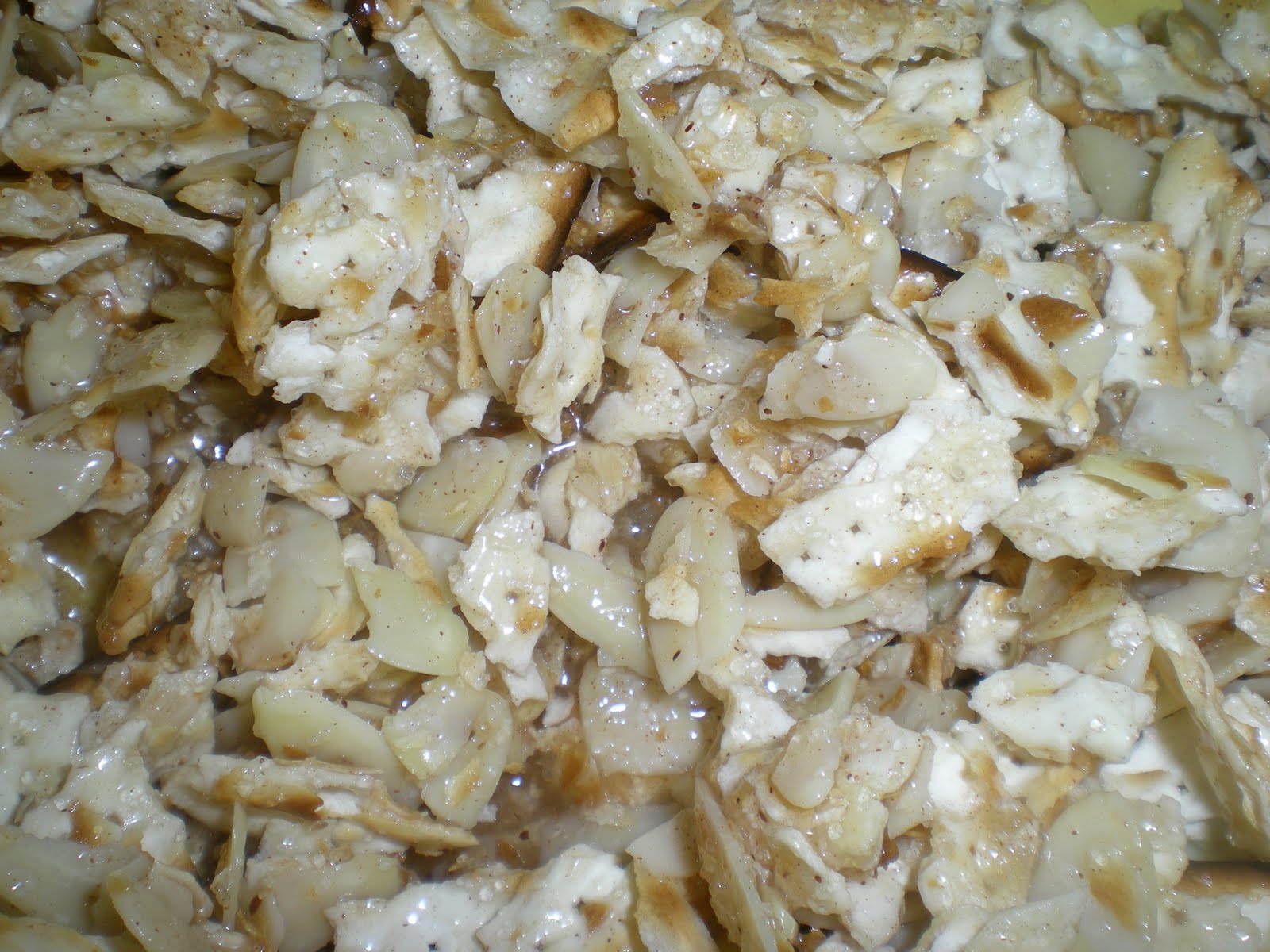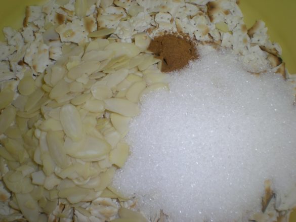 5. בקערה נפרדת מערבבים שברי מצה, סוכר, שקדים וקינמון.