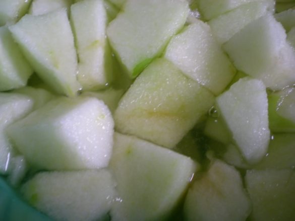 • לגבי כל עניין השריית התפוחים במים ולימון – לא ממש ידעתי מה זה אומר, אז הנחתי את קוביות התפוחים בקערה, מילאתי אותה במים וסחטתי מעל חצי לימון. כדאי לנסות להימנע מכך שגרעיני הלימון יפלו לתוך הקערה. וכדאי גם שאזכור את זה בפעם הבאה… סתם, בסוף הוצאתי את כל הגרעינים שנפלו לתוך הקערה. אני מקווה..
