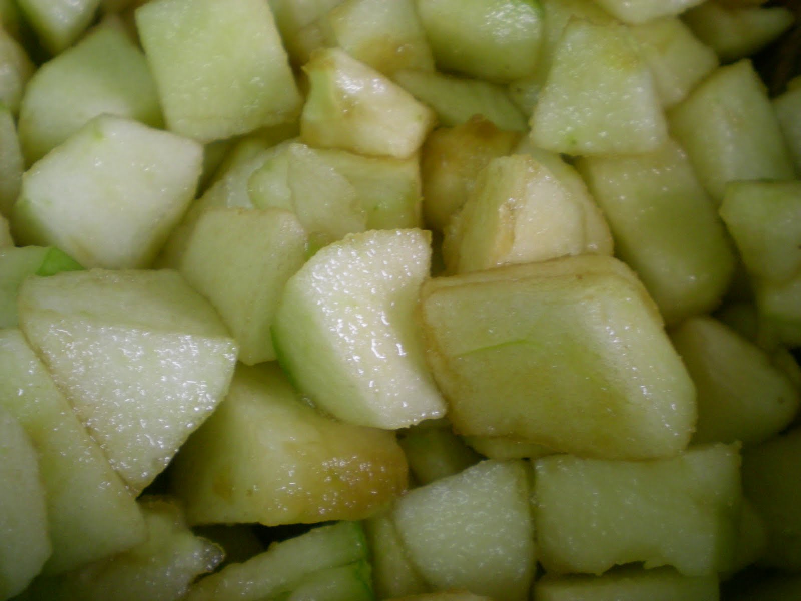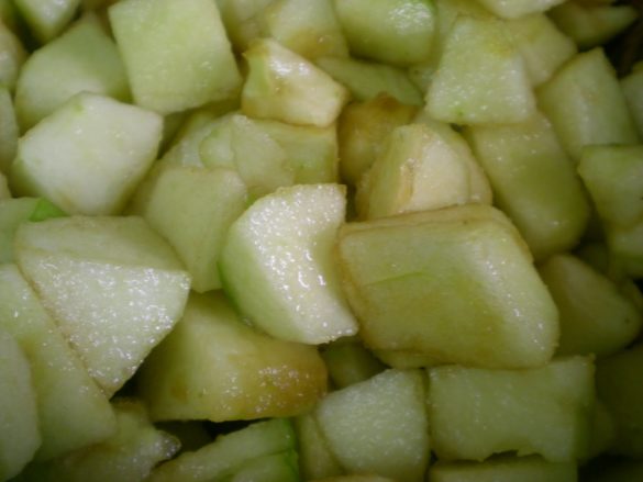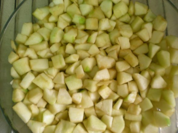 2. חותכים את התפוחים לקוביות קטנות מאד (לפי המתכון המקורי פורסים אותם דק מאד, אני העדפתי קוביות).
