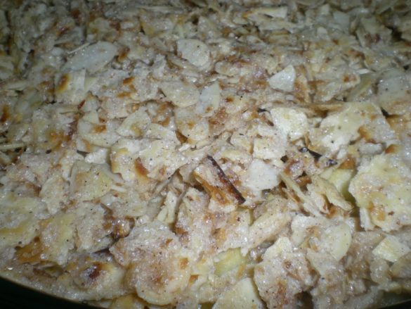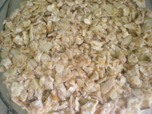 • ועוד משהו אחרון וכנראה לא באמת כל כך חשוב – אני העדפתי קודם כל להכין את השכבה העליונה של הקרמבל, כלומר המצות עם החמאה ושאר העניינים, ורק אז לקלוף ולחתוך את התפוחים, סתם כי לא רציתי שהם יעמדו יותר מדי זמן ויתחילו להשחיר בטעות (אם כי מיץ הלימון אמור היה למנוע זאת  בכל מקרה).