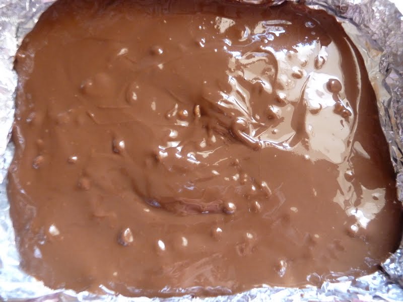3. מכינים “תבנית” קטנה מנייר כסף, מלבן בגודל של כ-15X18 ס”מ (אפשר להכין מלבן קטן יותר, אם רוצים צ’אנקס יותר עבים – עדכון: אתם רוצים להשתמש במלבן קטן יותר, אחרת שכבת חמאת הבוטנים תצא לכם דקה מדי וממש תתקשו לחתוך צ’אנקס. אני לא יודעת לומר מידות מדויקות, כי לא ממש מדדתי. אז לא מלבן קטנטן, אבל מספיק קטן כדי שהשכבה תצא די עבה ותאפשר חיתוך צ’אנקים. אוף, אני מעצבנת. אשתדל למדוד ולעדכן שוב בפעם הבאה שאכין את הפאי). יוצקים את התערובת לתוך התבנית.