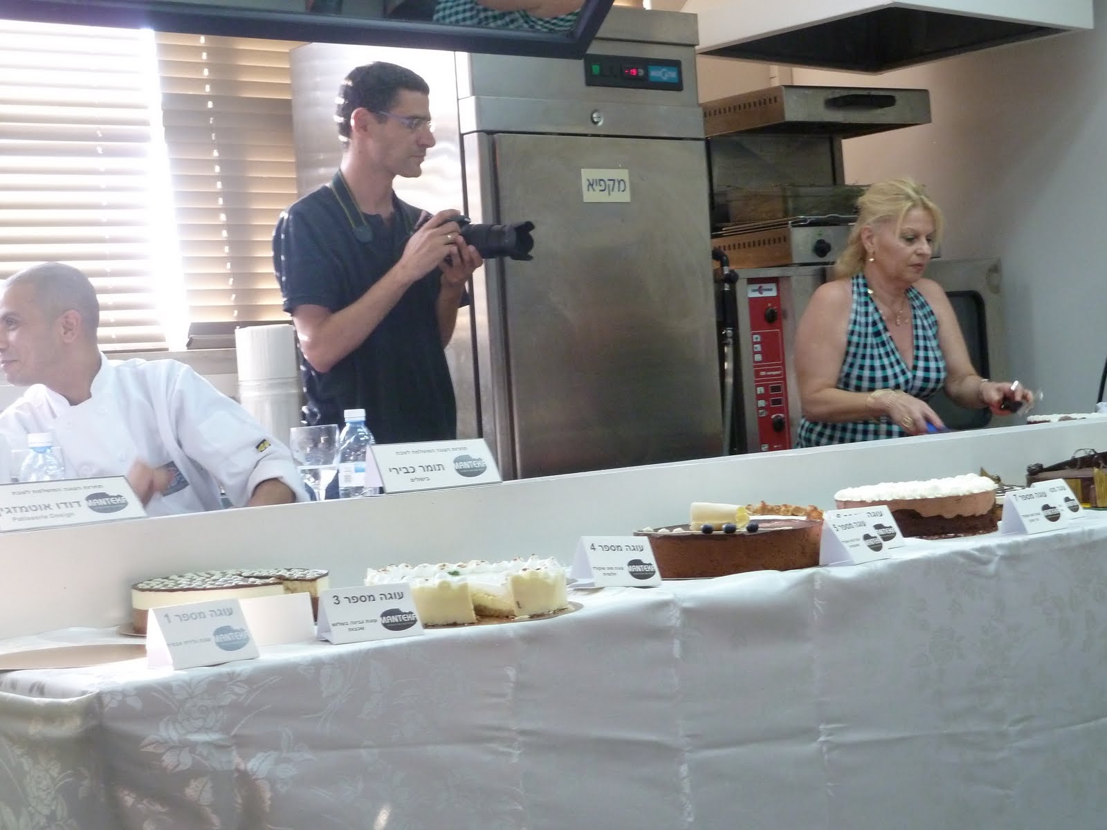 התחרות התקיימה אתמול, כאמור, בבית הספר “בישולים”. חמש עשרה עוגות עלו לשלב הגמר והובאו לפני שלושת השופטים: מאיר דנון – המנהל המקצועי של בית הספר, תומר כבירי – ראש המגמה לפטיסרי ב”בישולים”, ודודו אוטמזגין. כל אחת מהמשתתפות (נוצר מצב שכל ארבעה העשר העולים לגמר היו בעצם ארבע עשרה עולות. למה לא חמש עשרה, אתם שואלים? כי אחת המתמודדות, נורית גינת-אקסלרד, היתה גיבורה והשתתפה עם שתי עוגות שונות! כאילו שלא מספיק קשה להשקיע באחת…) היתה צריכה “להגן” על העוגה שלה מול השופטים. הם שאלו שאלות, אנחנו ענינו, ותוך כדי הם טעמו מהעוגה וכל אחת בתורה קיוותה שהשופטים לא יחטפו הרעלת קיבה מהעוגה שלה (או שאולי רק לי זה קרה?).