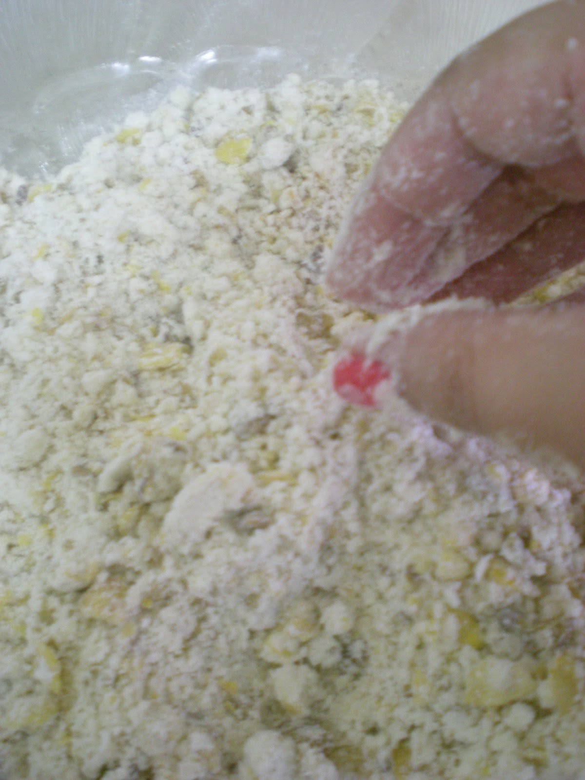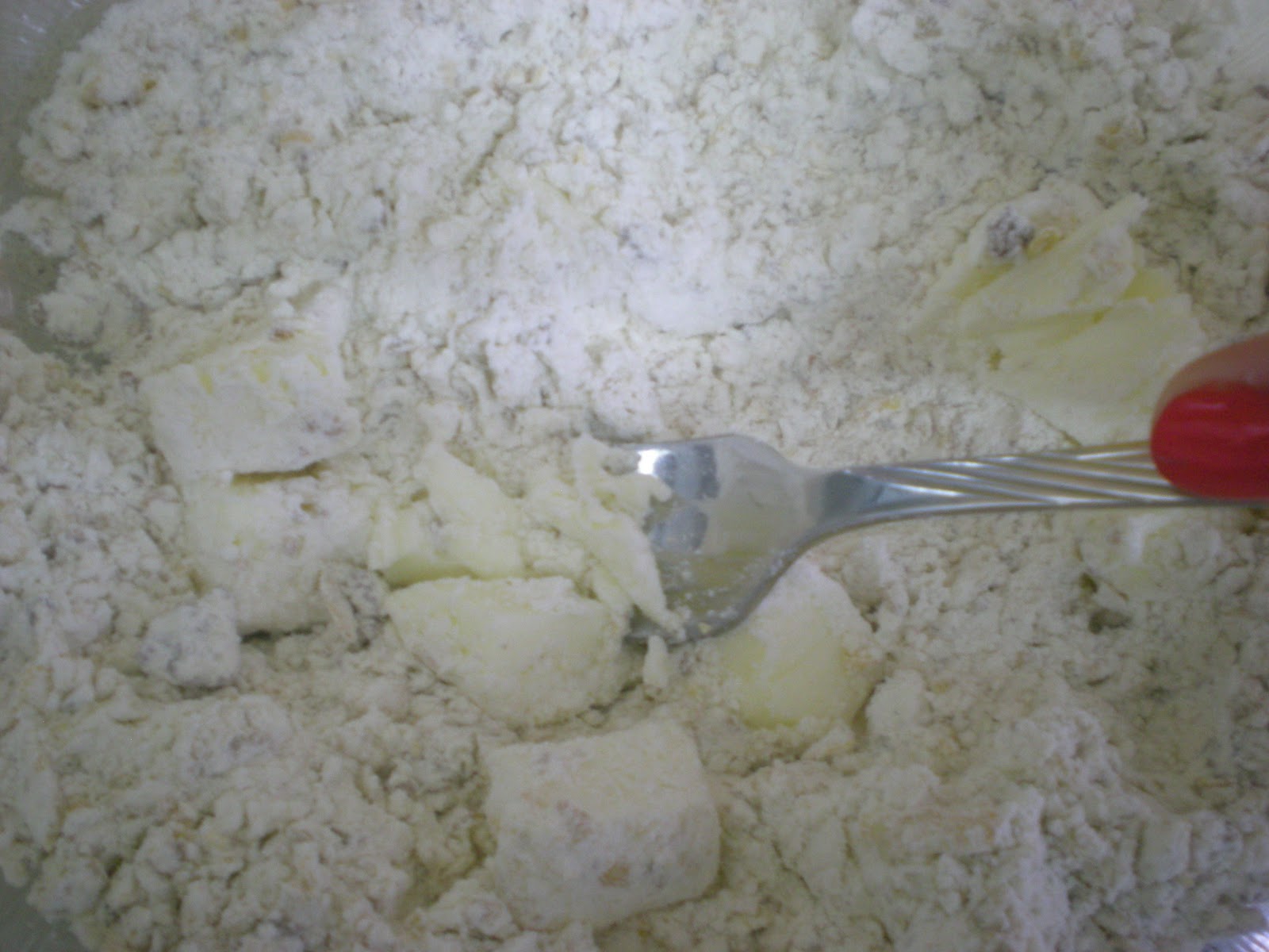 3. מוסיפים קוביות חמאה ובעזרת מזלג מטמיעים אותן בתערובת, עד לקבלת פירורים גסים. אני, אגב, התחלתי עם מזלג ומהר מאד עברתי לערבוב ידני. כן, עם הידיים! זה ממש לא לקח הרבה זמן.