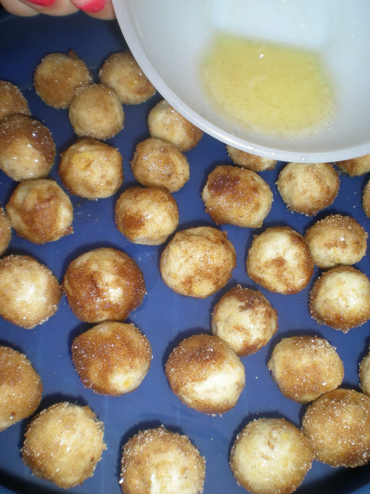 7. טובלים כל כדור בחמאה המומסת ולאחר מכן מגלגלים בתערובת הסוכר-קינמון.