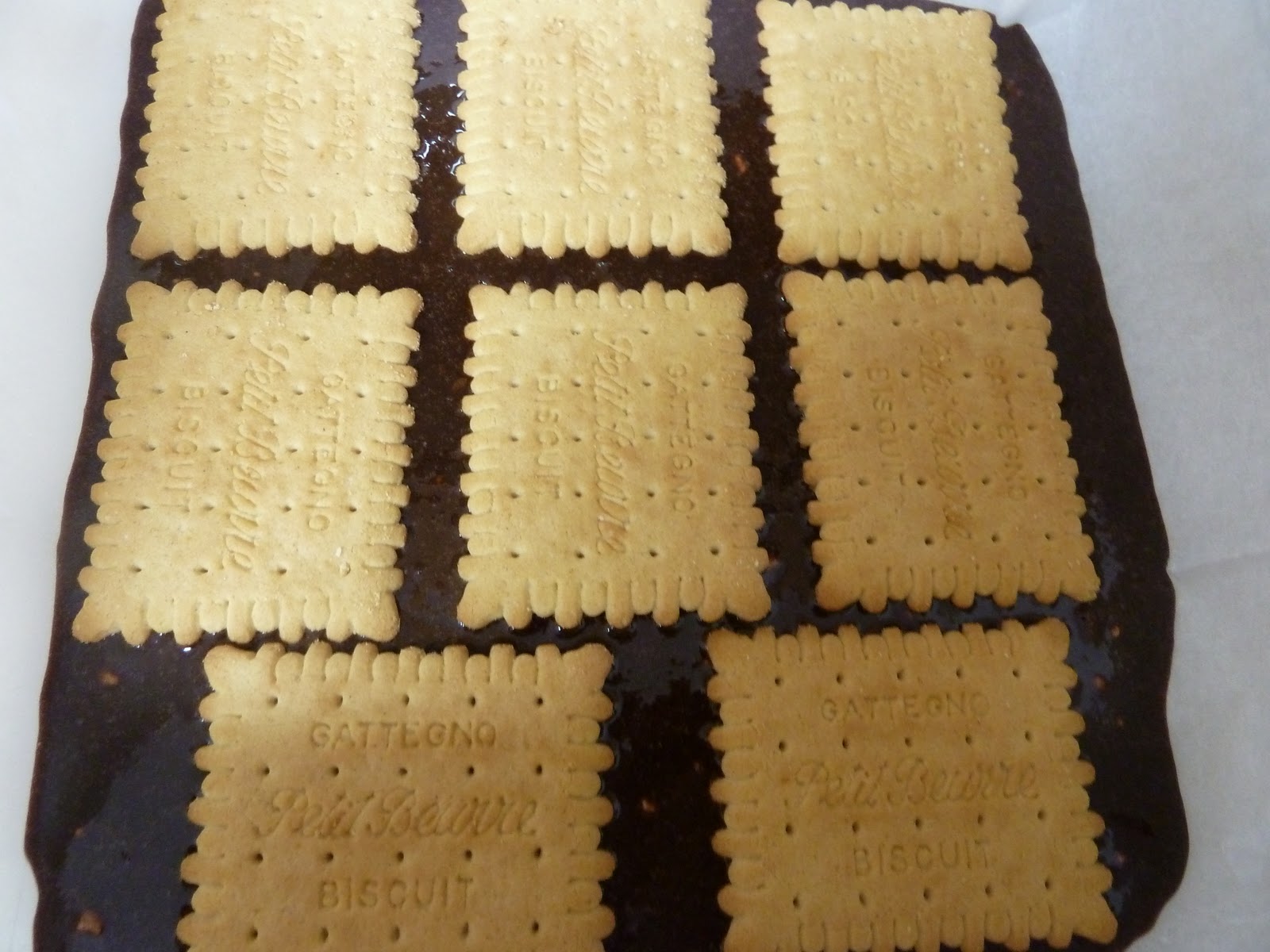- כפי שראיתם בתמונות, בלילת הבראוניז שלי לא לגמרי כיסתה את הביסקוויטים. כיוון שאין בבראוניז אבקת אפיה או משהו בסגנון, הם לא תפחו יותר מדי וגם בעוגה אפויה עדיין בלטו להם כמה ביסקוויטים. לדעתי האישית זה ממש ממש לא נורא, להיפך. אם אתם רוצים שהפתי בר יהיה הפתעה החבויה בתוך הבראוניז, פשוט צקו לתבנית (כן, צקו. המילה המוזרה בעולם) כמות קטנה יותר של בלילה בהתחלה, נניח שליש, סדרו את הביסקוויטים ומעליהם צקו (טוב, מזגו, אם אתם מעדיפים) את שאר הבלילה.
