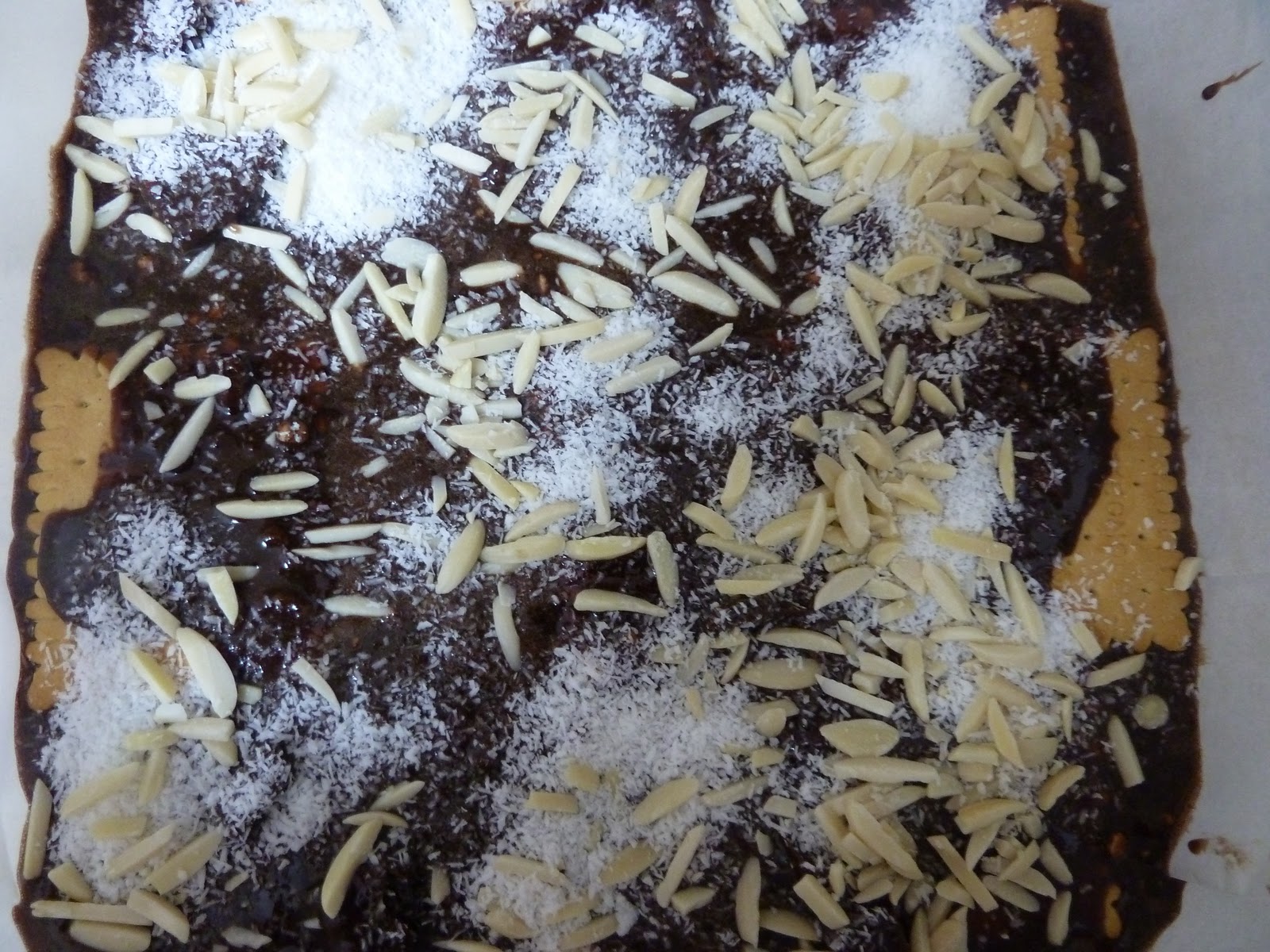 13. זורים מלמעלה קוקוס ושקדים – אני הנחתי אותם יחד בכוס וזריתי, אתם יכולים להתחיל בקוקוס ואז לזרות את השקדים או הפוך. זה לא באמת משנה, העיקר שהפיזור יהיה פחות או יותר אחיד.