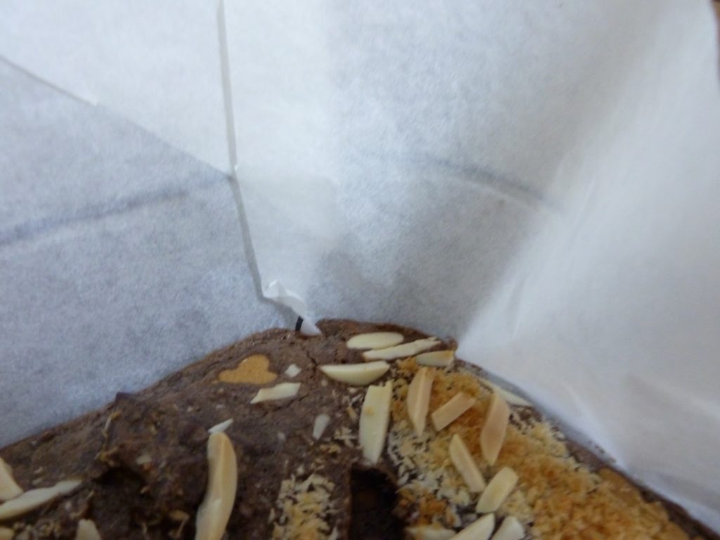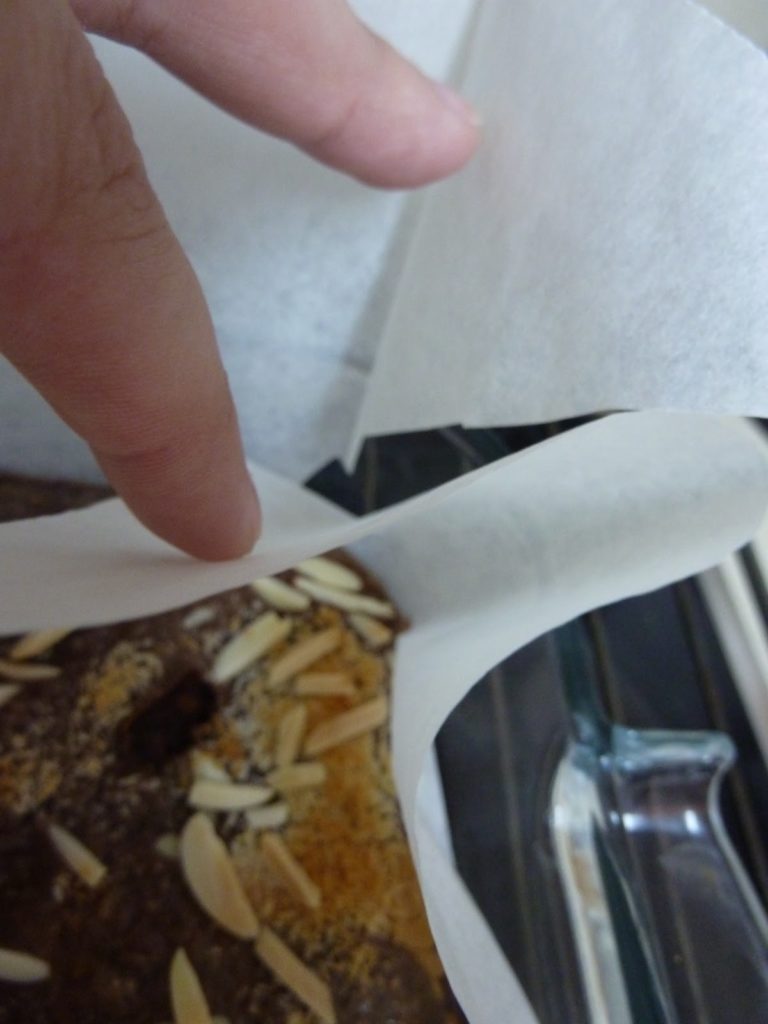 - משהו לא קשור ספציפית לבראוניז: כאשר מרפדים תבנית בנייר אפיה, לפעמים הנייר גדול מדי בשביל התבנית. אז אפשר להתחיל לגזור אותו כדי שיהיה בגודל הנכון, אבל קראתי לא מזמן – לא זוכרת איפה – שאפשר לגזור חתכים אלכסוניים בארבע פינות הנייר. כך אפשר להכניס צד אחד של כל פינה מתחת לצד השני (הלוואי שהייתי יודעת איך להתנסח כמו בן אדם), והנייר נכנס בצורה טובה יותר לתבנית. אני מרגישה שלא ממש הצלחתי להסביר את עצמי, אני מקווה שהתמונות תעשנה את העבודה…