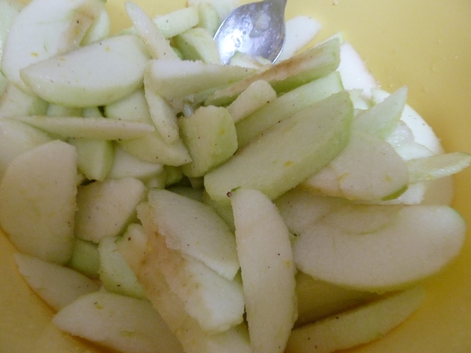 15. מוסיפים פרוסות תפוחים וגרידת לימון. מערבבים עד שהתפוחים מכוסים היטב בכל שאר הדברים שאיתם בקערה.