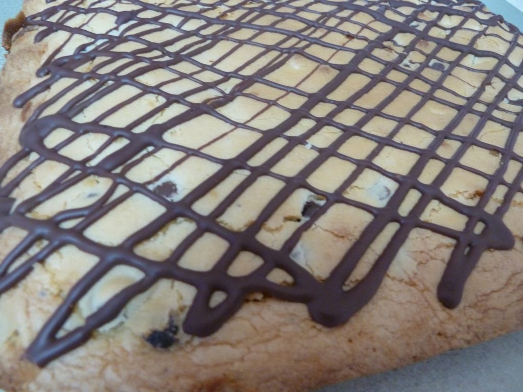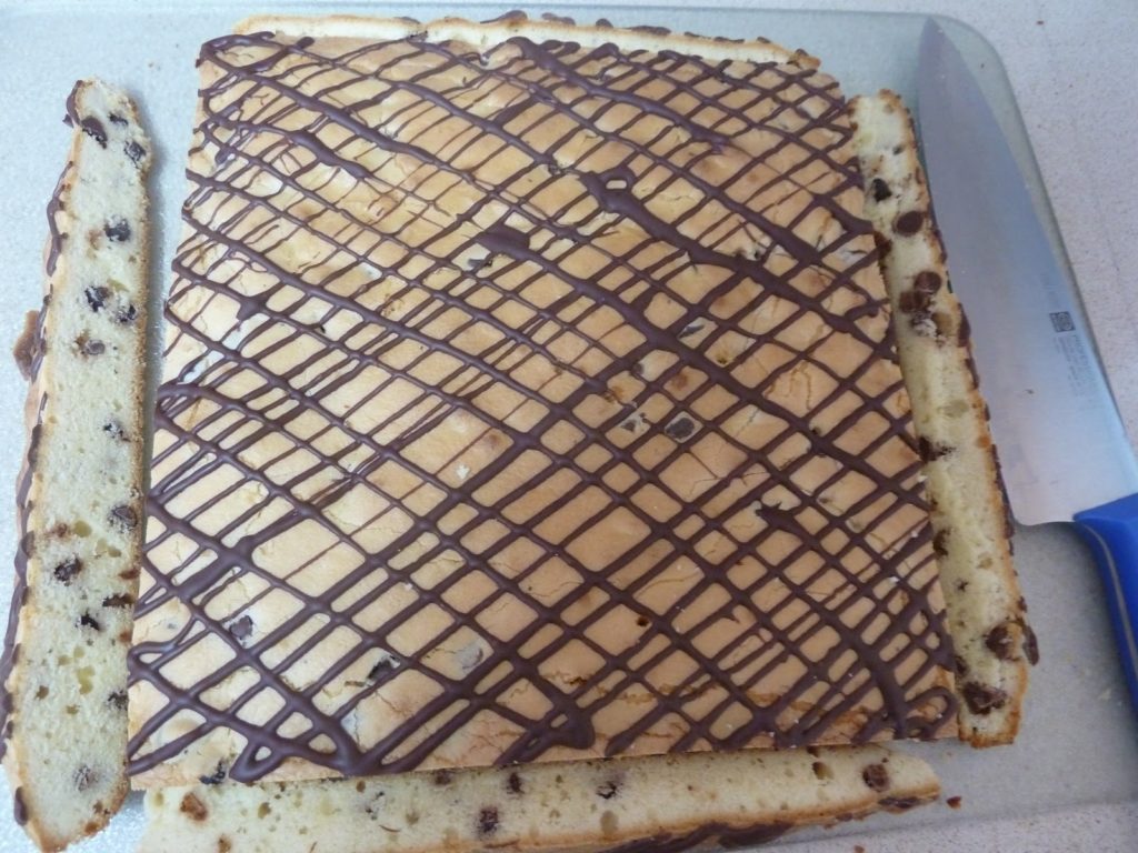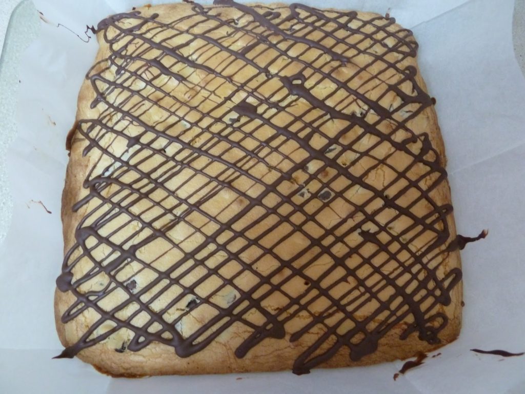 9. אם רוצים, ממיסים שוקולד מריר במיקרוגל ומעבירים לשקית ניילון קטנה. גוזרים חור קטנטן בקצה ומזלפים את השוקולד על פני המאפה, איך שרוצים. אני אוהבת לזלף פסים אלכסוניים מהפינה השמאלית העליונה לימנית התחתונה, וכן מהשמאלית התחתונה לימנית העליונה.