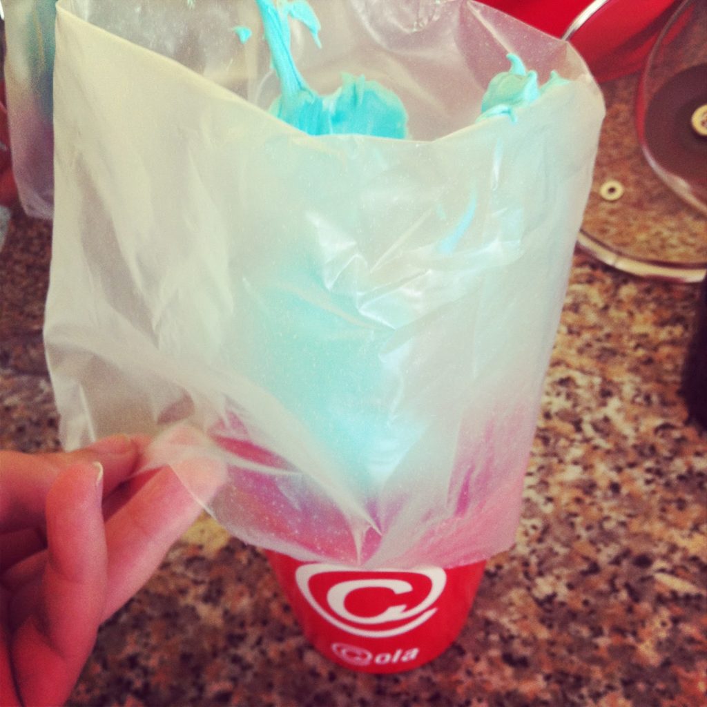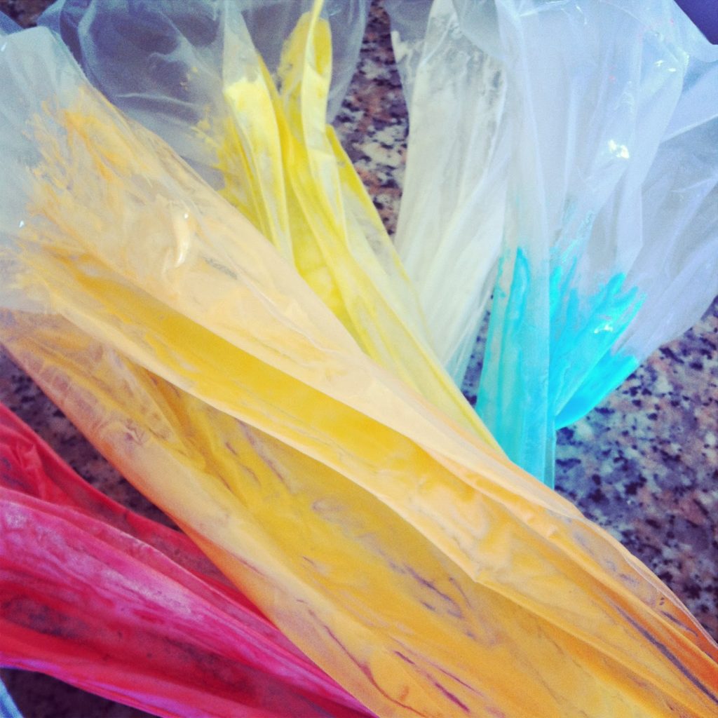 9. ממלאים שקי זילוף במרנגים הצבועים – כל צבע בשק, מן הסתם – וגוזרים את הקצה של כל אחד, על מנת לקבל חור קטן דרכו נוכל לזלף “חרוזים”. לחילופין, אפשר להשתמש בצנתר מתאים (#4 של וילטון, לפי דרלה. אבל אז צריך כמה כאלה.. אני העדפתי פשוט לגזור את קצה השק).