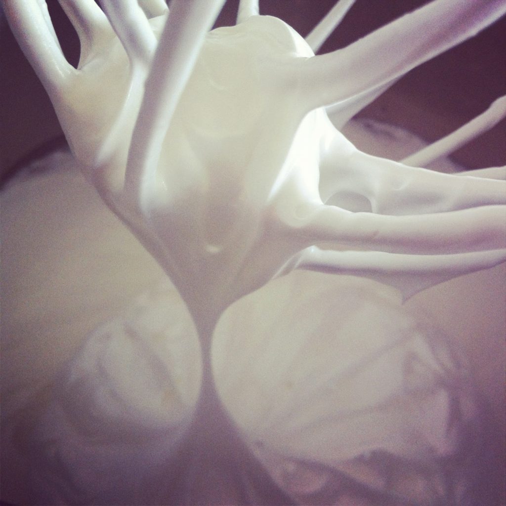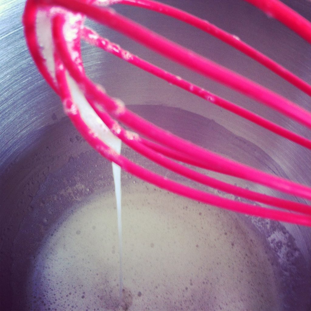 רגע. אני חוזרת שניה לאזהרות שלי מההתחלה. בעיקר לעניין הנמלים הסיזיפיות (אם אתם לא מכירים את הנמלים האלה, אין צורך לשאול את מאסטר גוגל. זה זן חדש שנתגלה ממש לפני חמש דקות על ידי חוקרת הנמלים הנודעת אני). כל הפרויקט הזה לוקח משהו כמו שלוש-ארבע שעות. הכנת המרנג זה ממש בקטנה – מחממים חלבונים וסוכר (וקרם טרטר, אם אתם לא אני ויש לכם בבית. לי אין, בעיקר כי אני מתנגדת אידאולוגית לאבקה שקוראים לה קרם. זה גרוע כמעט כמו קרטיב בטעם סוכריה. אם לא יותר) בבן מארי, ואז מקציפים מקציפים מקציפים. אם רוצים שהצמידים יהיו צבעוניים (ורוצים!), מחלקים לקערות ומוסיפים כמה טיפות צבע מאכל – וחומרי טעם כלשהם, אם בא לכם – לכל קערה.