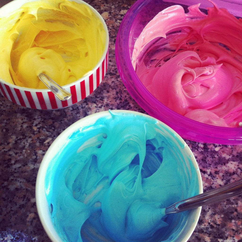 • נתחיל בצבעים: אני חילקתי לחמש קערות. אחת לא צבעתי והשארתי לבנה, ואת האחרות צבעתי בתכלת, צהוב, ורוד וכתום. השתמשתי בצבעי המאכל של וילטון, הוספתי ממש כמה טיפות מכל אחד. הצבעים היו ממש יפים, אם כי בתוצאה הסופית זה נראה פחות טוב. אני תכף אסביר למה.