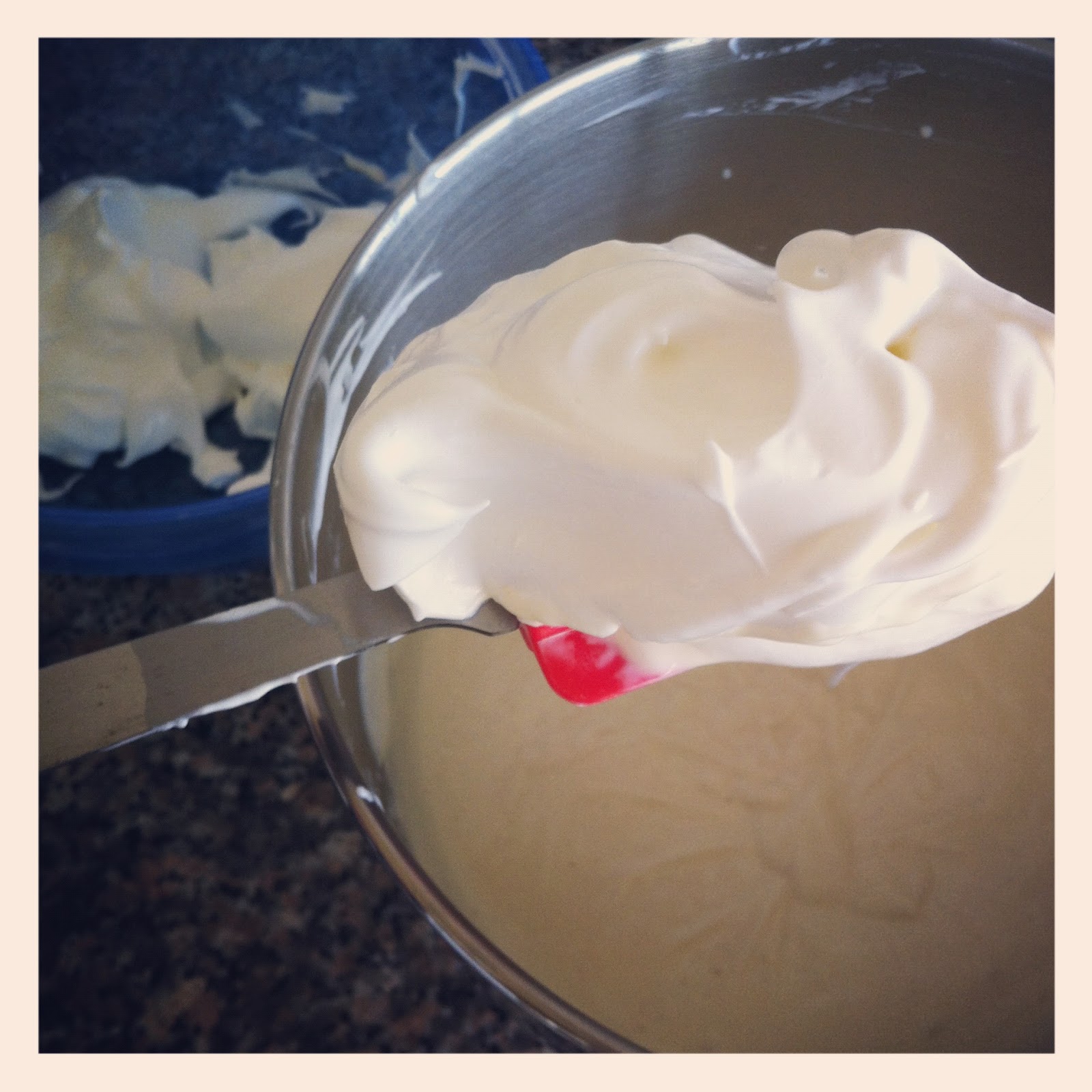 8. לאחר כחצי דקה-דקה מוסיפים חצי כוס סוכר. מגבירים בהדרגה את מהירות המיקסר, עד שמגיעים למהירות מקסימלית. בסך הכל אמורים להקציף משהו כמו שבע-שמונה דקות, עד לקבלת קצף יציב. מעבירים לקערה אחרת ומניחים בצד (אלא אם כן יש לכם שתי קערות מיקסר, ואז פשוט מחליפים קערה).