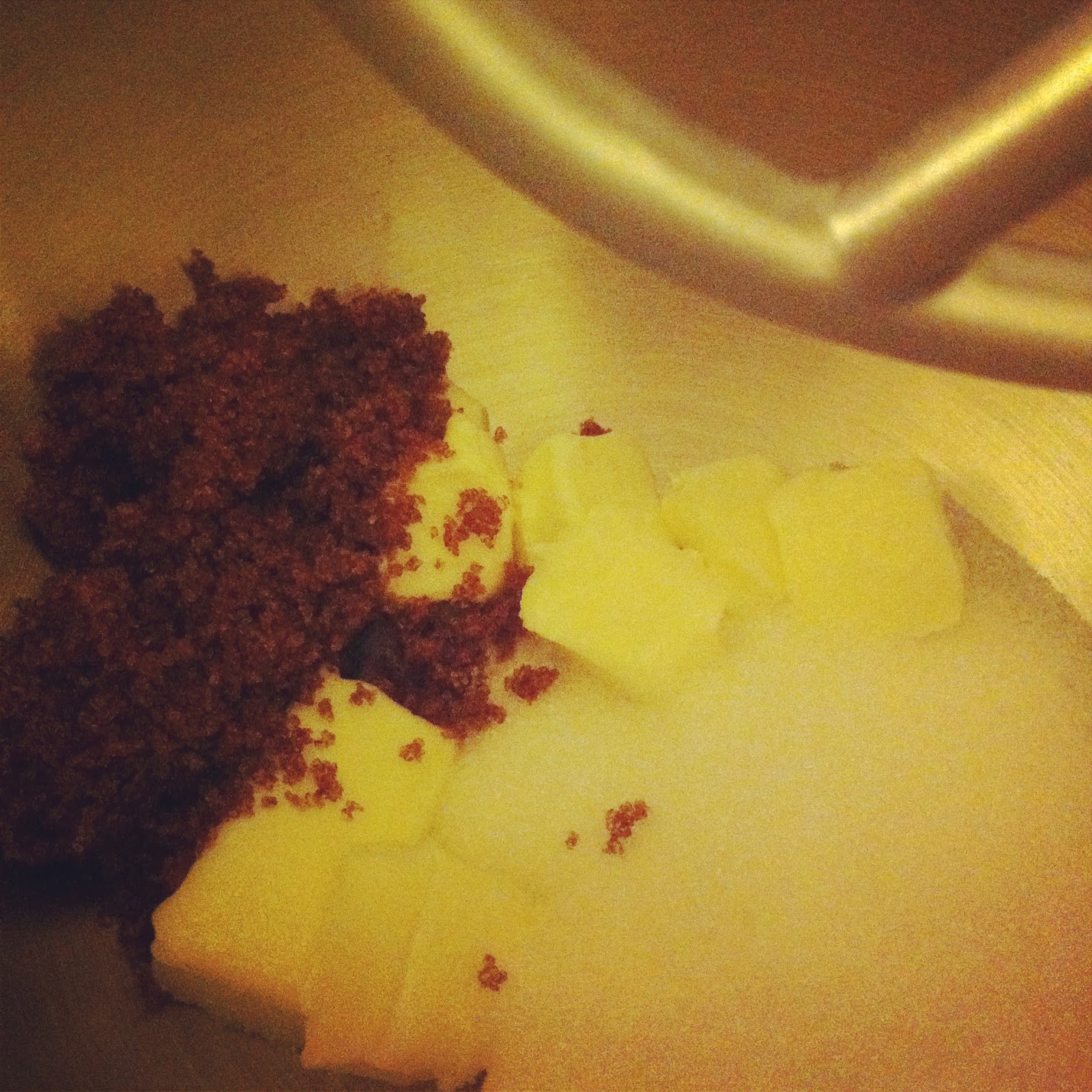 6. מניחים חמאה ושני סוגי סוכר בקערת המיקסר. מחברים וו גיטרה ומקרימים היטב על מהירות בינונית-גבוהה, משהו כמו שלוש-ארבע דקות. אם צריך, עוצרים את פעולת המיקסר מדי פעם ומנקים את דפנות הקערה בעזרת לקקן.