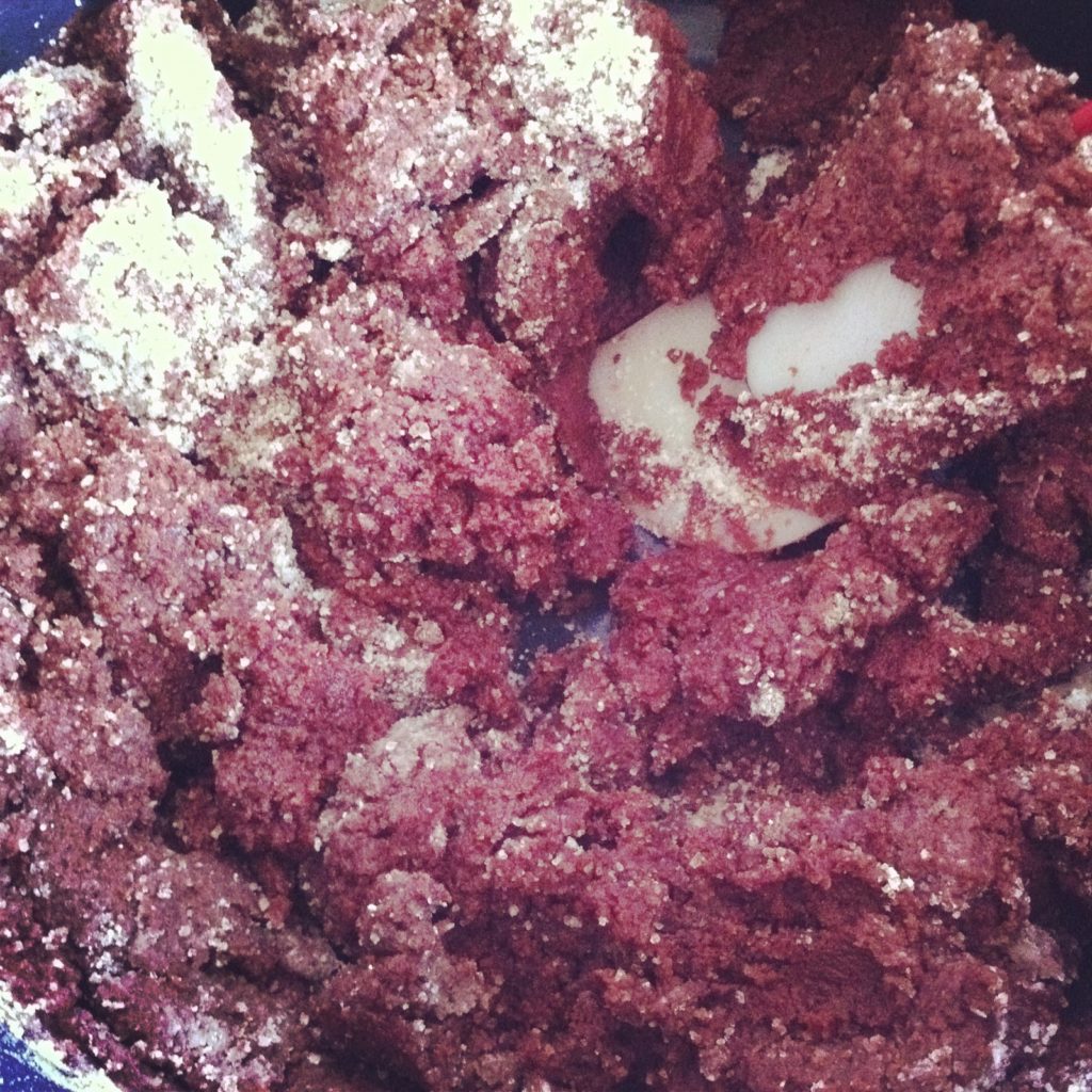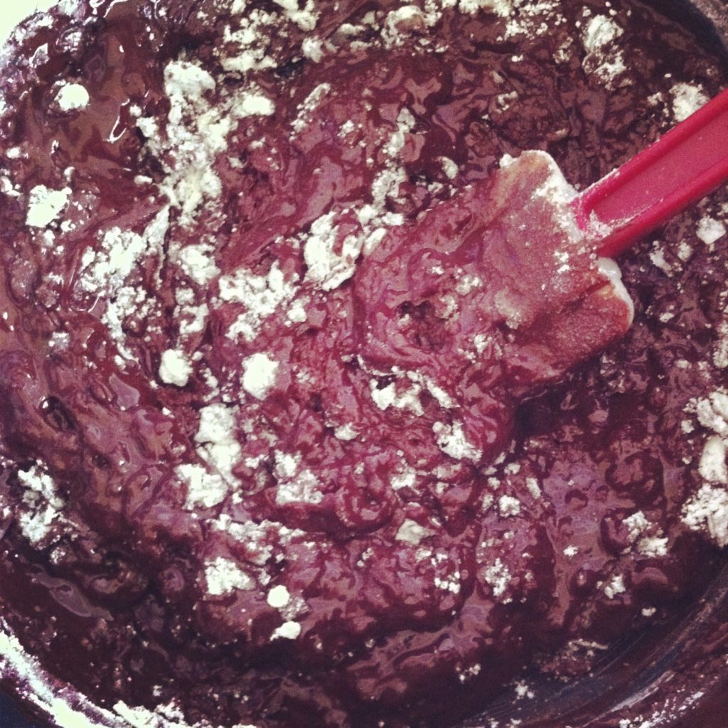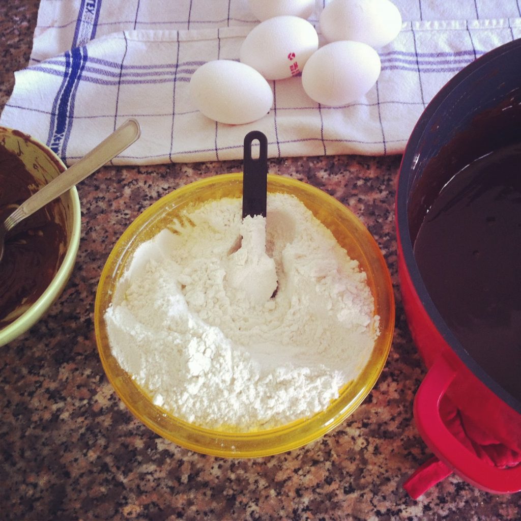 4. מוסיפים יבשים (קמח, אבקת אפיה ומלח) לשוקולד והחמאה ומערבבים.