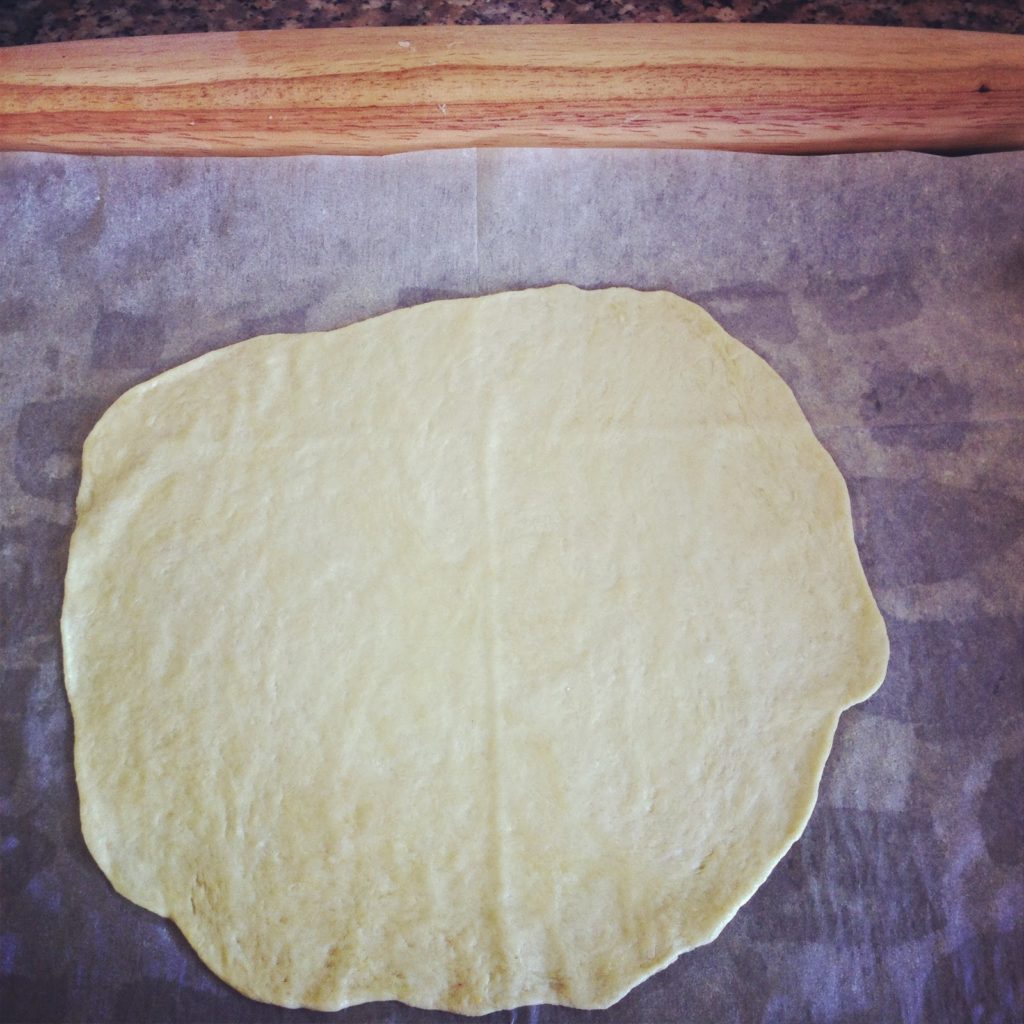 6. מניחים את חתיכת הבצק עליה עובדים על נייר אפיה ומרדדים לעיגול דק מאד בקוטר של כ-25 ס”מ. בתכלס, הצורה והגודול לא מאד משנים, העיקר שהבצק יהיה דק.
