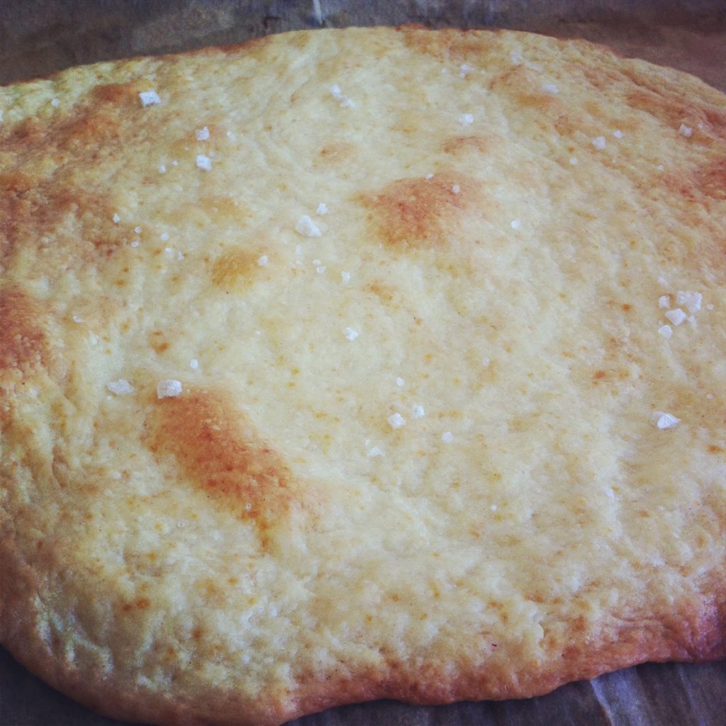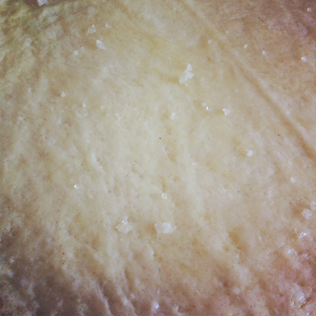 7. מברישים קלות את פני הבצק בשמן זית וזורים מעט מלח גס, אותו אפשר לנעוץ בעדינות לתוך הבצק, על מנת שיישאר במקום. הבצק שלי היה די שומני, אז לא הברשתי בעוד שמן. לשיקולכם..
