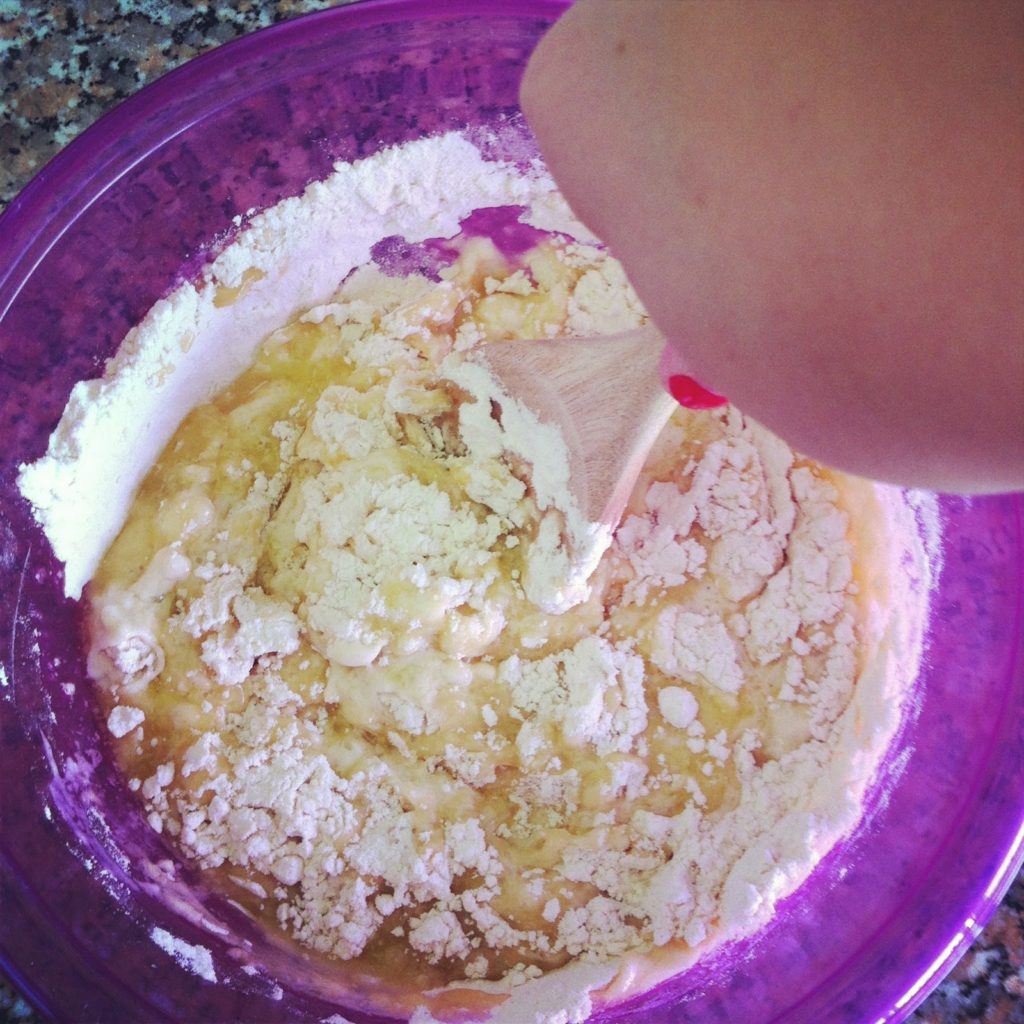 3. יוצרים גומה במרכז הקערה ומוזגים פנימה מים ושמן. מערבבים בהדרגה לתוך הקמח, עד לקבלת בצק.