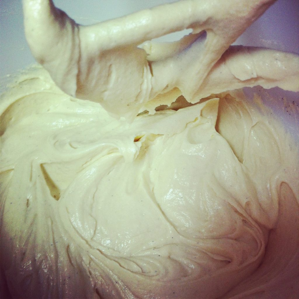 לגבי איך לצפות עוגה בקרם חמאה ושהיא לא תצא מעאפנה, צריך מספיק קרם והמון אימון. עוזר מאוד להשתמש ב-crumb coat. עושים שכבה דקה ובסיסית של קרם שעוטף את העוגה והוא זה שתופס את כל הפירורים שיורדים מהעוגה לפרוסטינג. הוא גם משפכטל את העוגה לצורה שאת רוצה (אם יש חורים או בורות או גובה לא אחיד ממלאים בפרוסטינג). אז מקררים/מקפיאים ומצפים שוב, וזה הרבה יותר נוח ואסטטי. אבל זה סיפור מההפטרה. צריך עצבים בשביל זה.
