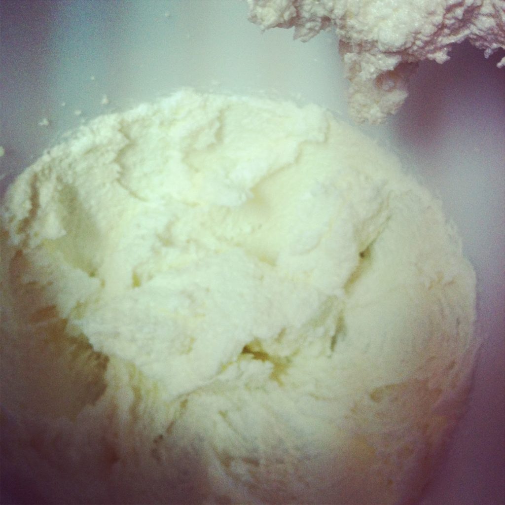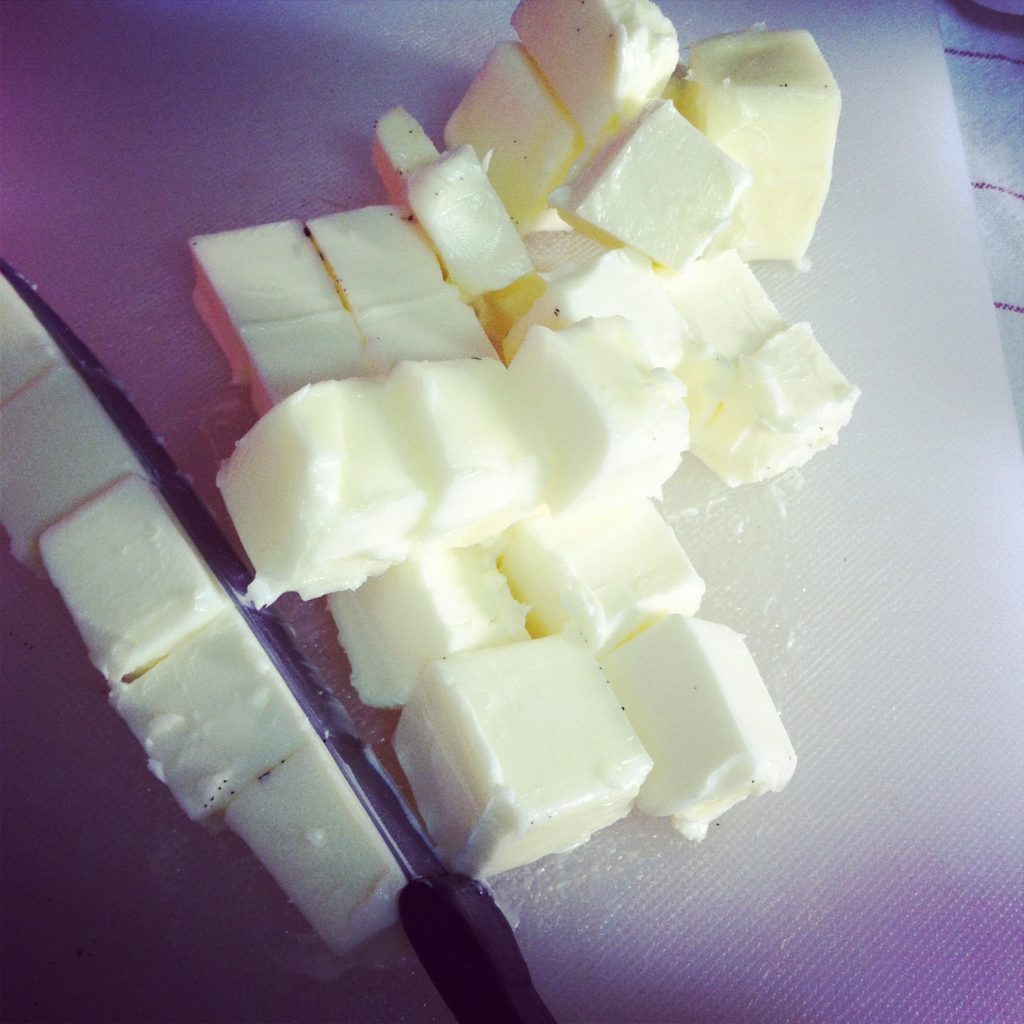 4. מניחים חמאה וסוכר בקערה המיקסר. מחברים וו גיטרה ומקרימים עד לקבלת תערובת בהירה ותפוחה, משהו כמו 3-5 דקות. מנקים דפנות עם לקקן, על מנת לוודא שהכל מעורבב ואחיד.