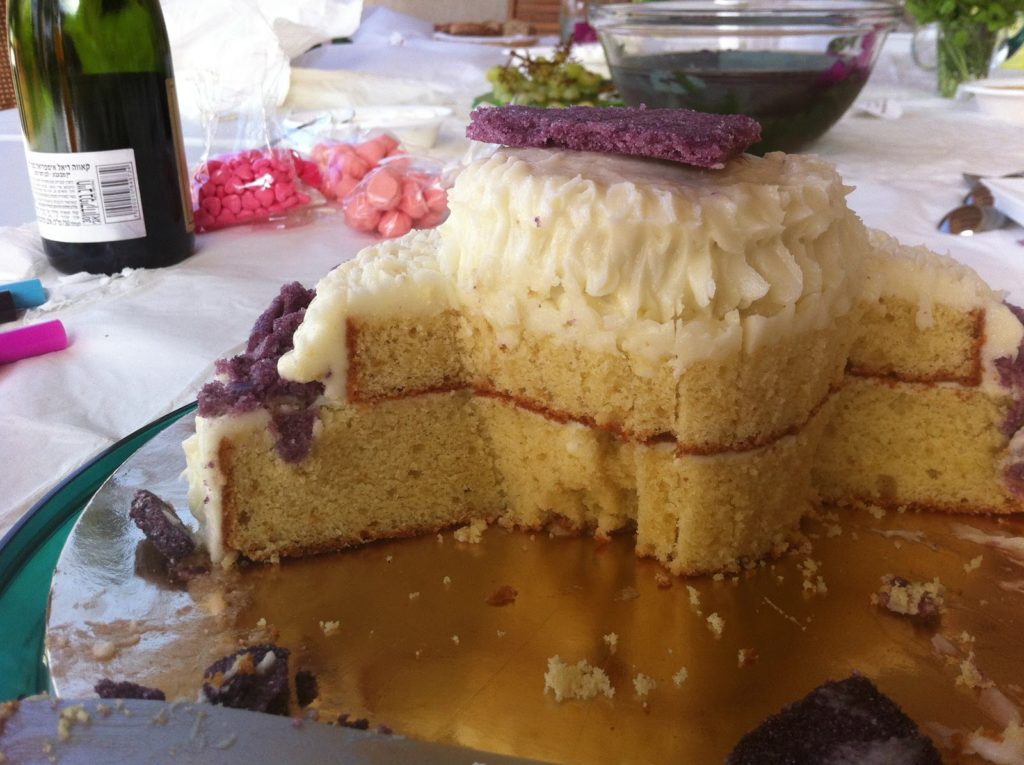 העוגה עצמה, אגב, היתה מעולה. הכנתי אותה בשלושה רינגים בגדלים שונים, והיא היתה קלה להכנה והבלילה היתה מעלפת והעוגה עצמה? וואו. יכול להיות שההתלהבות שלי מהטעם היא פשוט כי לא ציפיתי ש”סתם” עוגת וניל (אוקיי, עם מקל וניל, אבל בכל זאת.. כולה עוגת וניל) תהיה כל כך טובה, אבל היא היתה. גם אחרי שהוצאתי אותה מהקפאה (אתם מבינים, אפיתי את הקומות של העוגה כמה ימים לפני מסיבת הרווקות, הקפאתי וערב לפני המסיבה הפשרתי וקישטתי. ניסיתי לקשט. רגע, כבר מגיעים לזה), היא היתה פשוט טעימה.