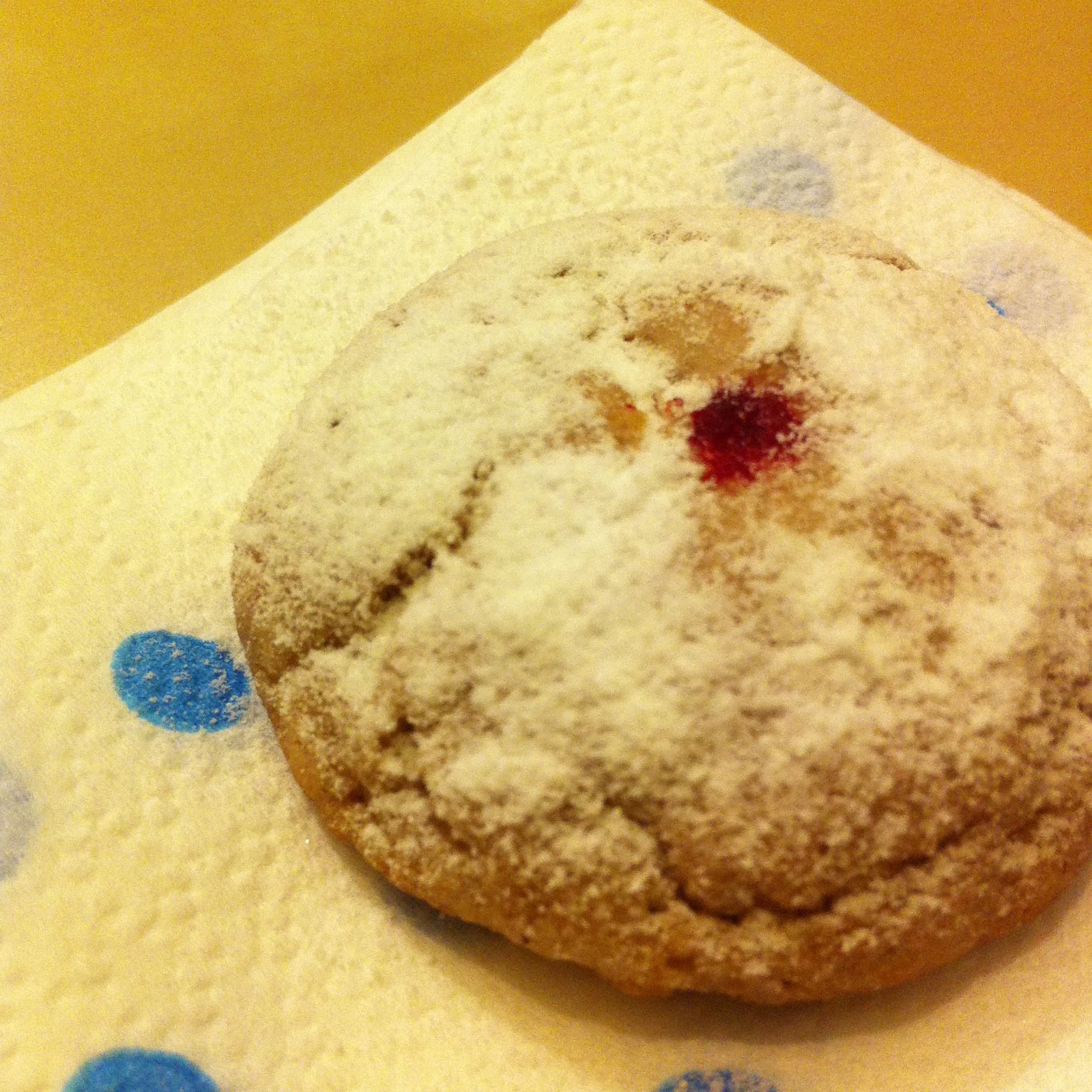 - אני משערת שפחות בוער לכם לעשות את השטות הזאת, אבל למקרה שאתם מתעניינים – מראה ה”סופגניה” מתקבל על ידי זריית אבקת סוכר מעל העוגיות ומעט צבע מאכל אדום: טובלים קצה של קיסם בצבע מאכל ומסובבים אותו קצת במרכז העוגיה, כך שמתקבל כתם בערך עגול, אבל ממש לא אחיד. כמו ריבה אמיתית 😉