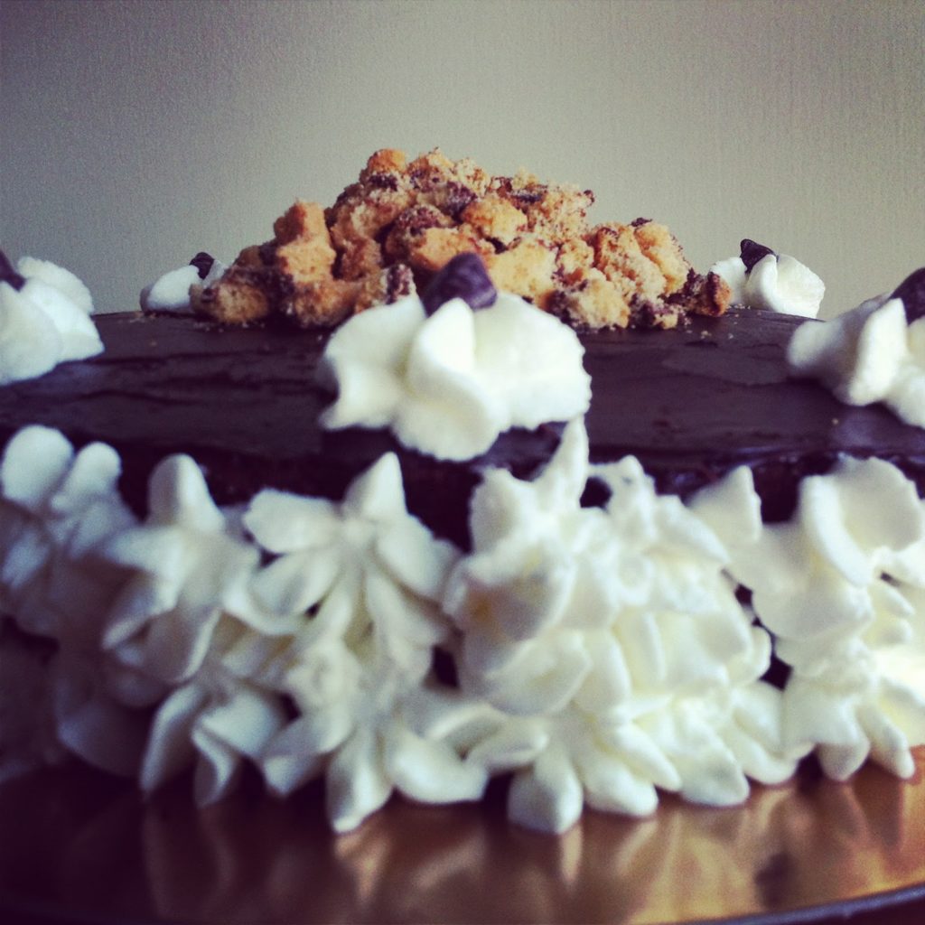 פשוט.. כמו תמיד.. תכננתי את העוגה הזו מלא מלא זמן. ממש מלא. במשך חודשים ידעתי שאני רוצה להכין “עוגה מקושטת בפירורי עוגיות”. רק המתנתי להזדמנות. ואז חברה שלי הזמינה אותי לבראנץ’ לכבוד יום ההולדת שלה, אז לא היתה ברירה. החלטתי להכין עוגה מצופה בפירורי עוגיות.. ואת הלחם קוקוס המעולה, רק בצורת מיני מאפינס. כמה זה טעים. וגם שבלולי שמרים במילוי קינמון וקקאו, אבל זה יצא.. לא משהו. אני מחמיאה לעצמי. יבש. יצא יבש לאללה. אוף.