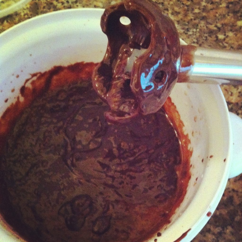 3. כאשר השמנת מתחילה לבעבע, יוצקים מעל השוקולד. טוחנים ישר עם בלנדר מוט או שממתינים שתיים-שלוש דקות ומערבבים, עד לקבלת גנאש חלק.