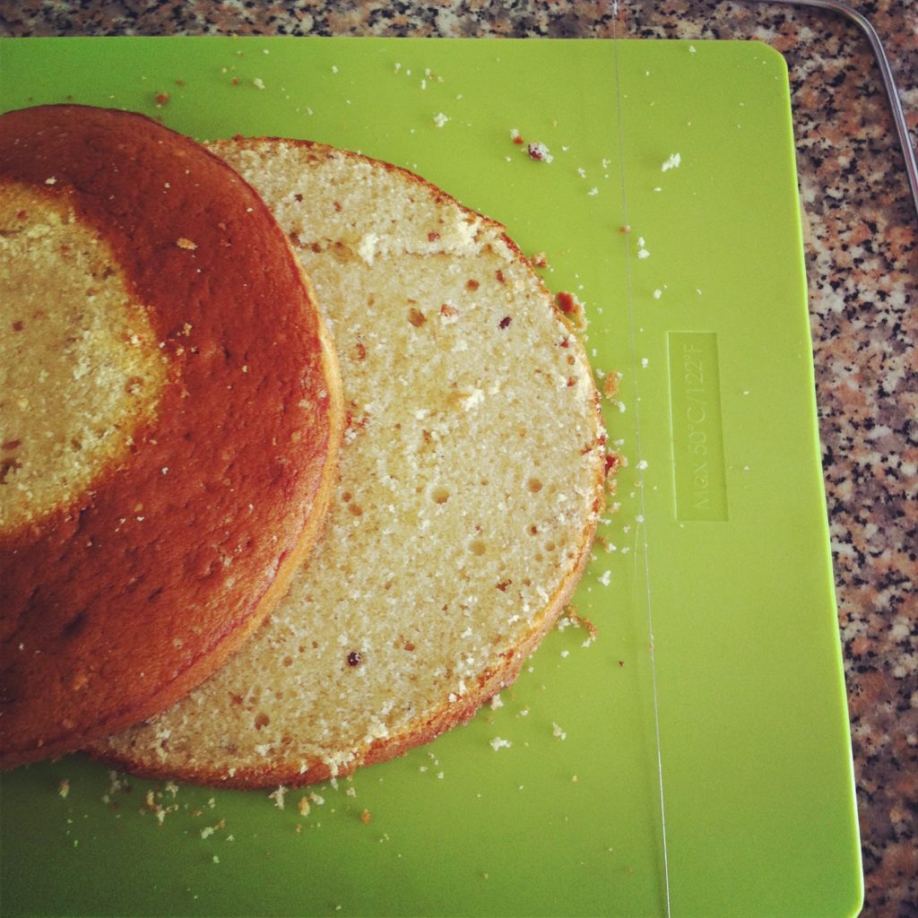 13. כשהעוגה התקררה, פורסים אותה לשתיים או שלוש שכבות שוות. אם צריך, מיישרים את החלק העליון.
