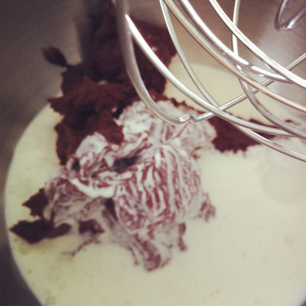 11. כאשר הבלילה כמעט אחידה לגמרי, עוצרים את פעילות המיקסר ומערבבים מעט עם לקקן – חשוב לאסוף הכל מהתחתית, על מנת שהבלילה תהיה אחידה וחלקה.