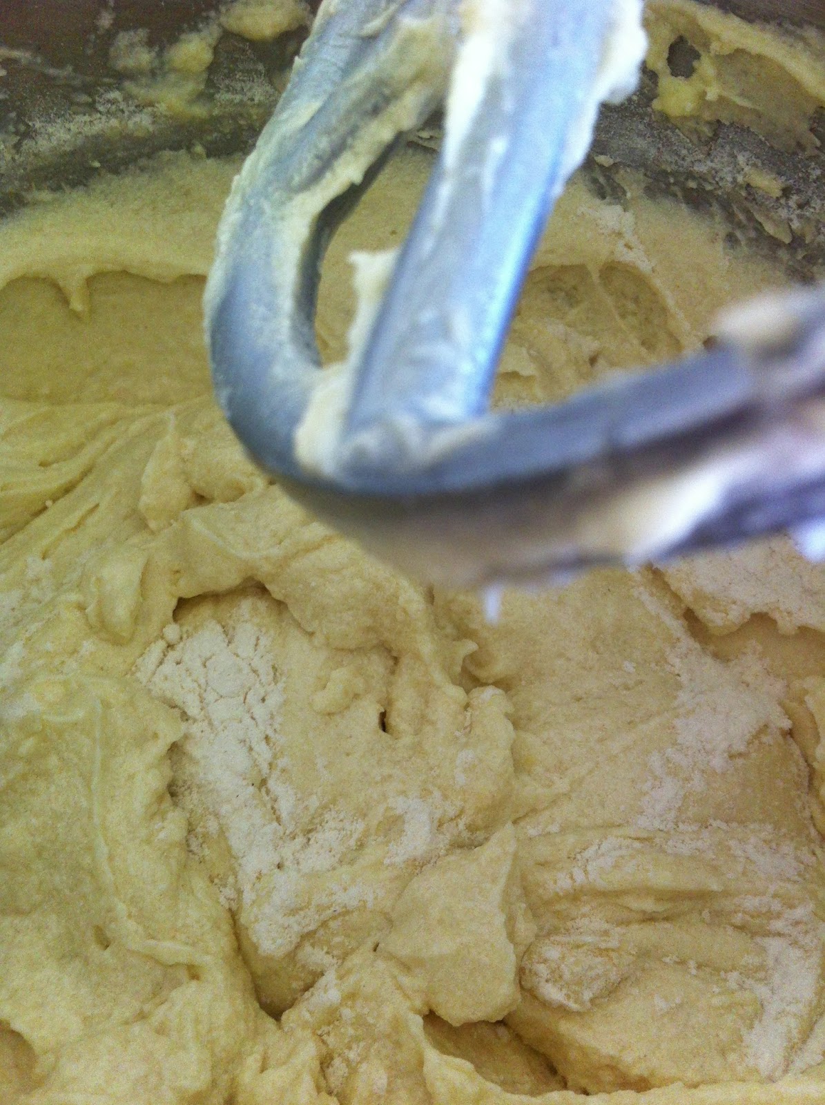 5. מנמיכים את מהירות המיקסר ומוסיפים תערובת יבשים וחלב לסירוגין: מתחילים בשליש מתערובת היבשים, חצי חלב, שליש יבשים, שאר החלב ושאר היבשים. מערבבים מעט בין כל הוספה.
