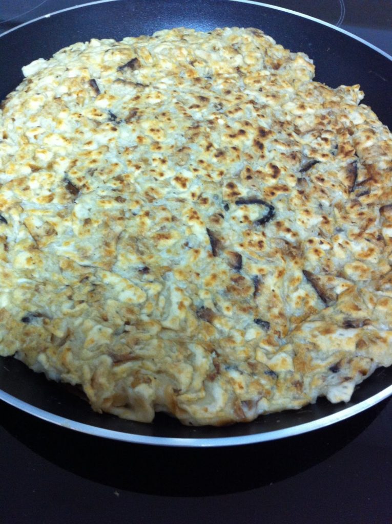 5. מעבירים את כל התערובת למחבת ומיישרים כך שהיא ממלאת את כולה. מטגנים על חום גבוה למשך דקה-שתיים, על מנת לצרוב קצת את המצה בריי. אם יש מכסה למחבת, אפשר להשתמש בו.