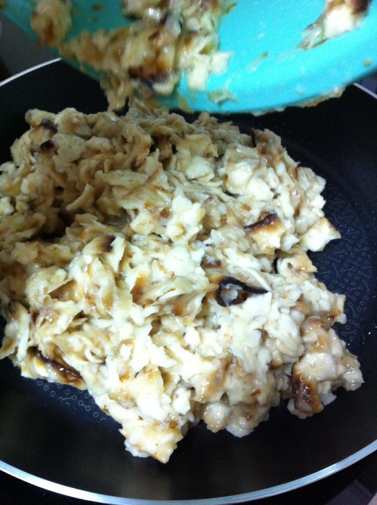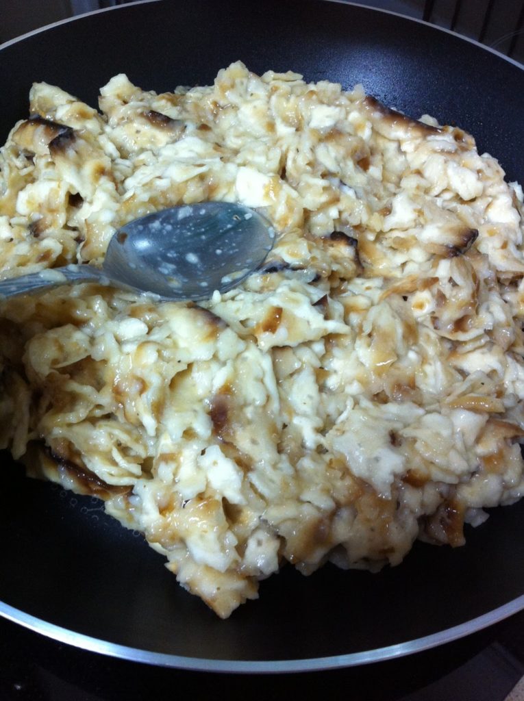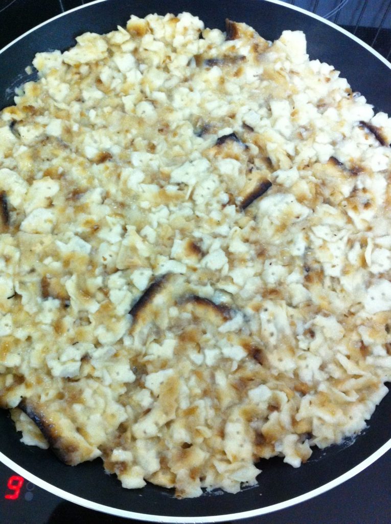 6. מנמיכים את האש לבינונית ומטגנים עוד ארבע-חמש דקות (אולי אפילו קצת יותר, תלוי כמה התערובת במחבת עבה). מדי פעם מנערים מעט את המחבת, על מנת לוודא שהמצה בריי משוחרר ולא נדבק לתחתית.