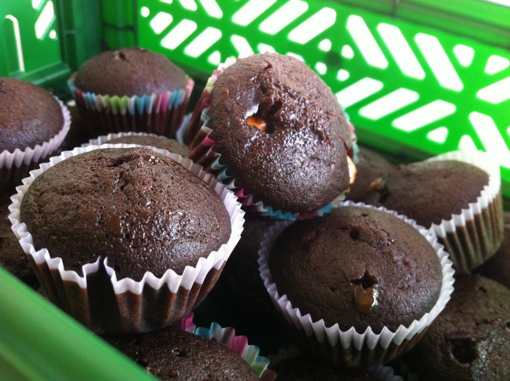 קודם כל, חציתי כמויות, כי לא רציתי המון מאפינס. ואז המרתי את הסוכר הלבן בסוכר חום כהה ודבש. השתמשתי בקפה במקום חלב, הוספתי כל מיני תבלינים. את הביצה מהמתכון דווקא השארתי, כי לא כל כך התחשק לי להשתמש בחצי ביצה. אה, והוספתי באטרסקוטץ’ צ’יפס, כי יש לי כל מיני כאלה בבית והם ממש לא טעימים לי, אז אני מנסה לדחוף אותם לכל מתכון אפשרי, היות שבאפיה הטעם שלהם קצת מתעמעם. בקטע טוב.