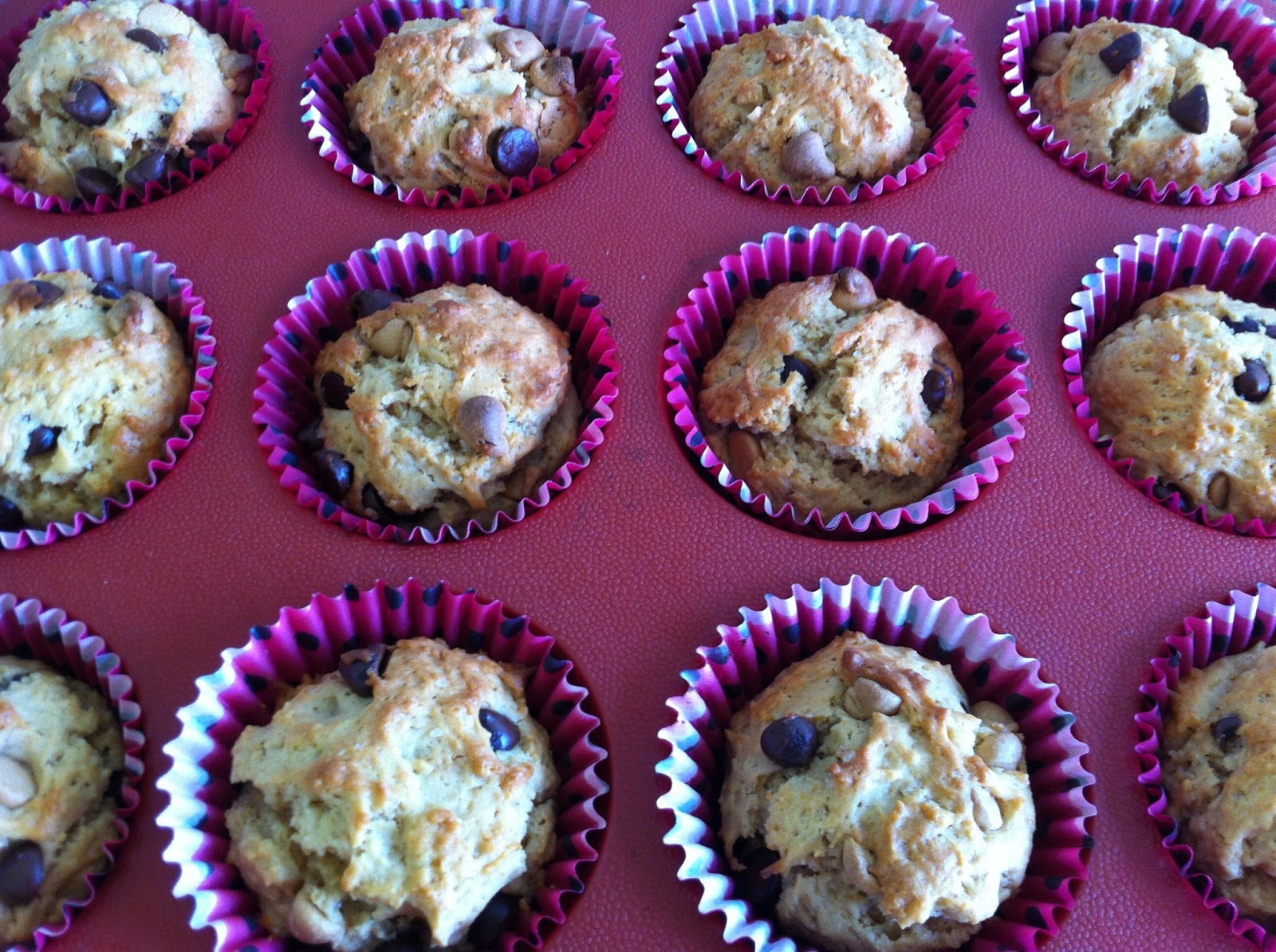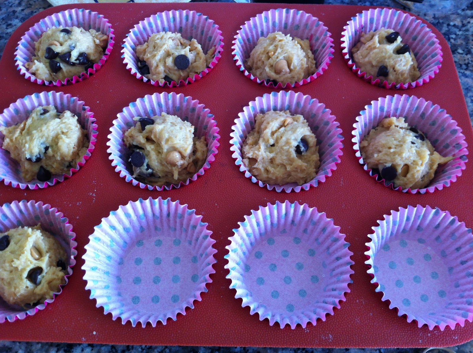 אחר כך התלבטנו האם להכין מתכון נוסף או לא. איכשהו, אחרי חצי שנה של תכנונים, היה לנו רק מתכון אחד. והיינו קצת לחוצות בזמן. בסוף החלטנו שאנחנו מסוגלות ליותר – פני מצאה מתכון למאפינס חמאת בוטנים ושוקולד צ’יפס, והכנו גם אותו. היא ערבבה את היבשים, אני את הרטובים, איחדנו, חילקנו לשקעים, אפינו והידד.
