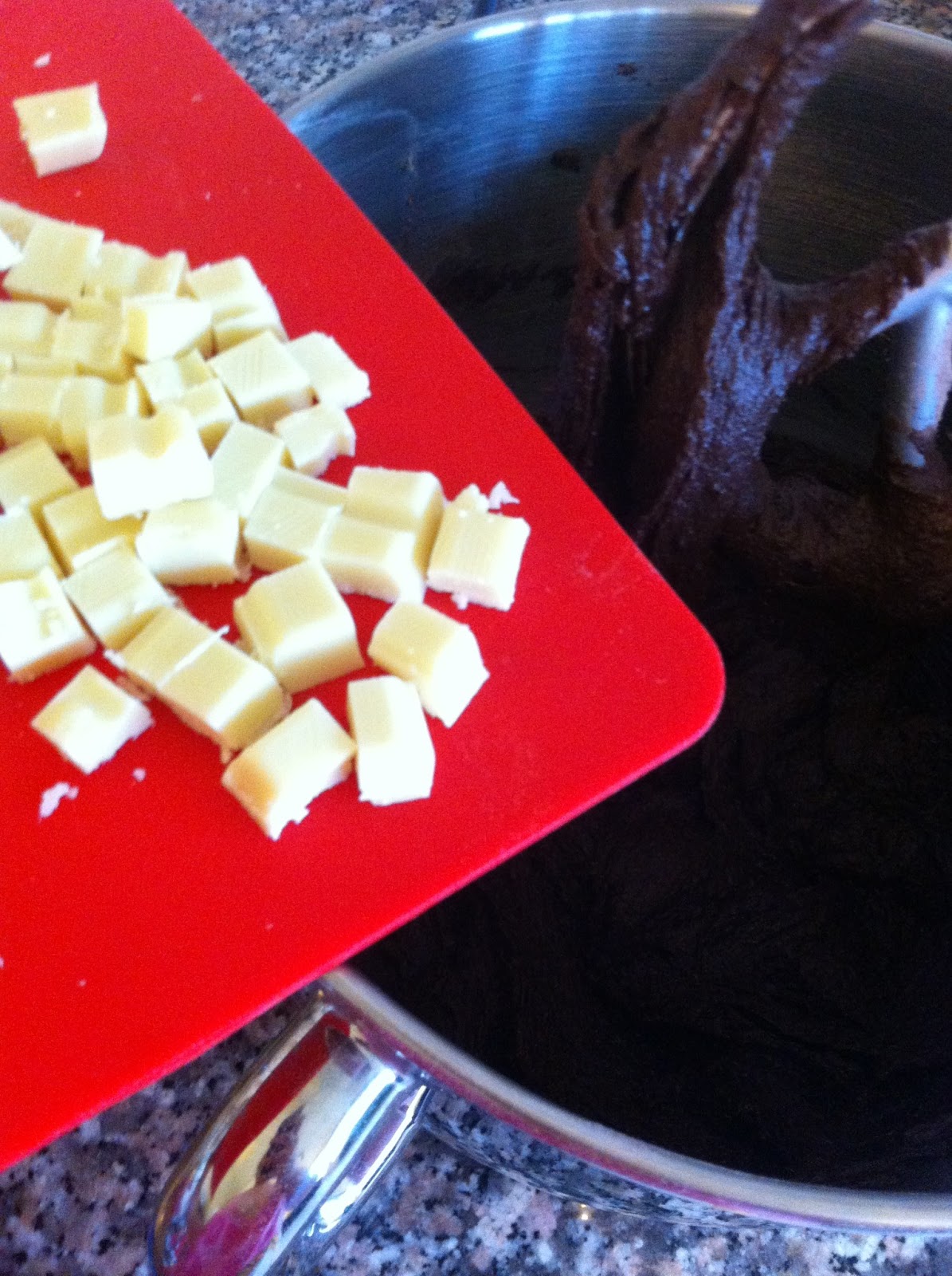 • השוקולד הלבן במתכון והא לא חובה. אפשר לוותר עליו, אפשר להשתמש בשוקולד צ’יפס כמו במתכון המקורי. הכל הולך.