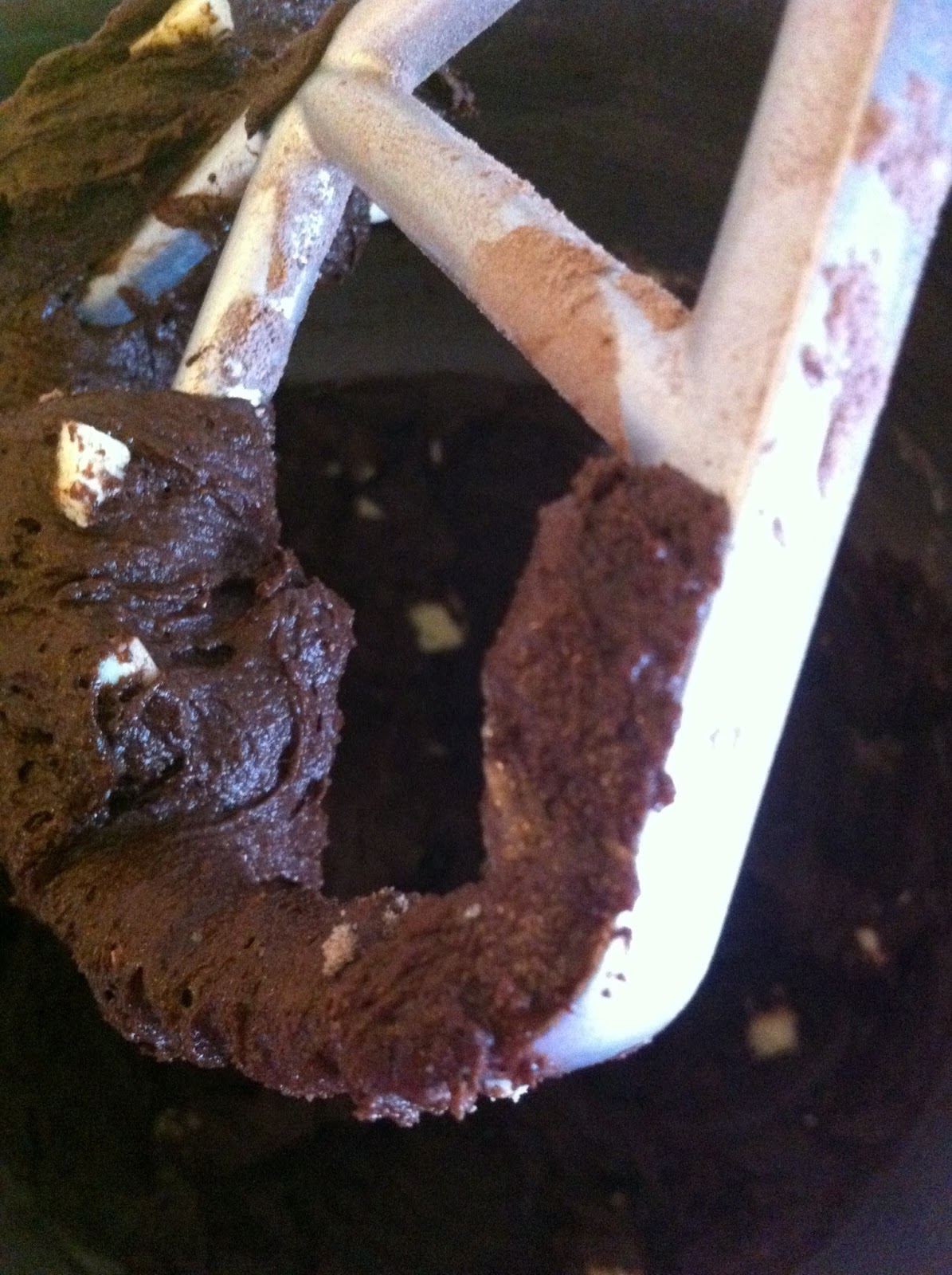 6. מוסיפים שוקולד לבן ומערבבים קלות – בעזרת המיקסר או עם לקקן – רק עד לפיזור אחיד של השוקולד.