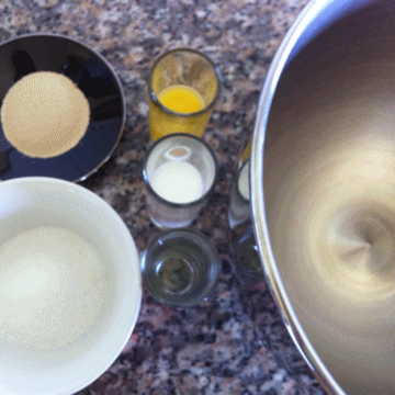 1. מניחים מיץ, חלב, סוכר ושמרים בקערת המיקסר. מערבבים ומניחים בצד ל-5-7 דקות.