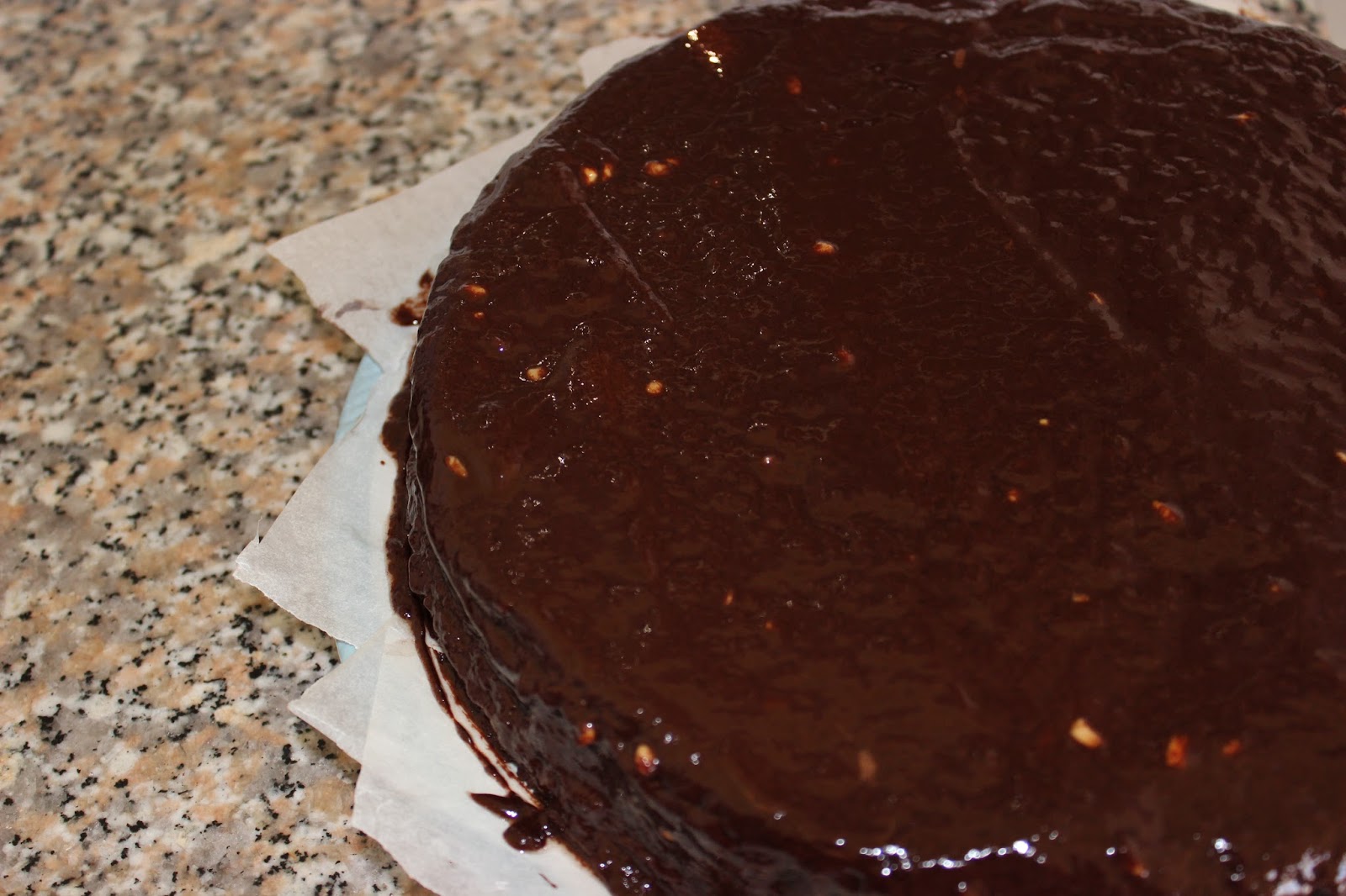 מקור המתכון: העוגה מבוססת על המתכון הזה, עם שינויים (הכמויות נתונות בגרמים ולא בכוסות + פחות סוכר + תוספת של חמאת בוטנים). הקרם והציפוי לא לקוחים משום מקום. הבוטנים המצופים לקוחים מהסופר.