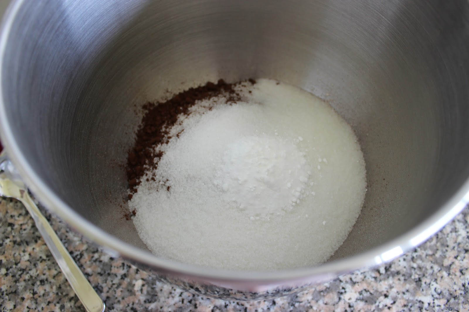 2. מניחים קמח, סוכר, קקאו, סודה, אבקת אפיה ומלח בקערת המיקסר. מחברים וו גיטרה ומערבבים מספר שניות, עד להתאחדות.