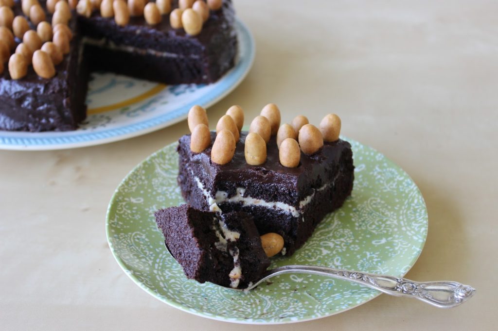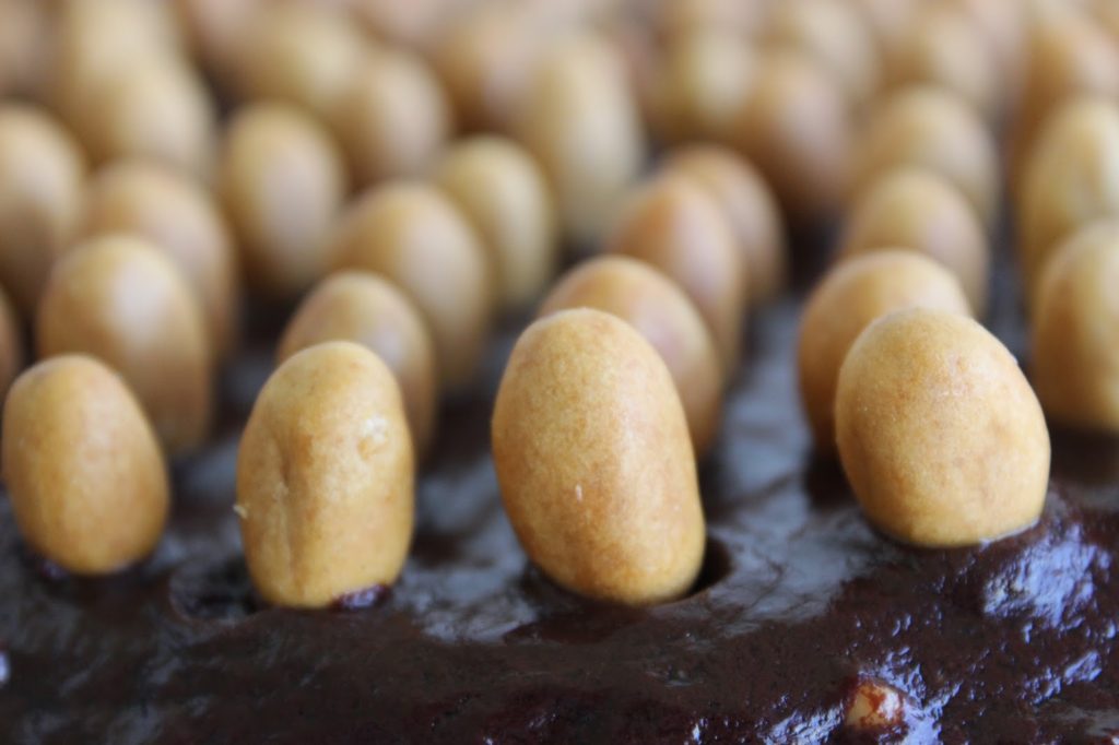 - לגבי הגנאש – כפי שכבר ציינתי, מתקבלת שכבה מאד עבה ופאדג’ית. אני חושבת שזה נהדר, אבל אפשר להכין גנאש עם יחסים קצת שונים (יותר שמנת, פחות שוקולד) אם רוצים קרם יותר דק ועדין. אבל תופעת לוואי חיוביות של השכבה הפאדג’ית שלי: בגלל שהיא היתה מאד עבה, הבוטנים הצליחו לעמוד בתוכה בצורה מאד יציבה, כמו בבוץ או בביצה או משהו (אלה הדימויים שלי? בשיא הרצינות?). אני חוששת שאם הגנאש היה עדין יותר, הבוטנים היו מחליקים ועפים לכל עבר. אז אני ממליצה דווקא להישאר עם קרם פאדג’י כזה.