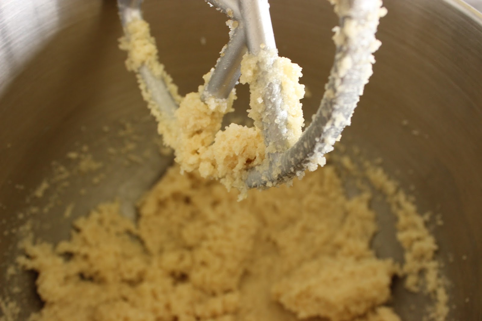 1. מניחים חמאה ושני סוגי סוכר בקערת המיקסר. מחברים וו גיטרה ומערבלים במהירות בינונית למשך כשתי דקות, עד לקבלת תערובת אחידה. מדי פעם עוצרים את פעולת המיקסר ומורידים את החמאה מדפנות הקערה בעזרת לקקן.