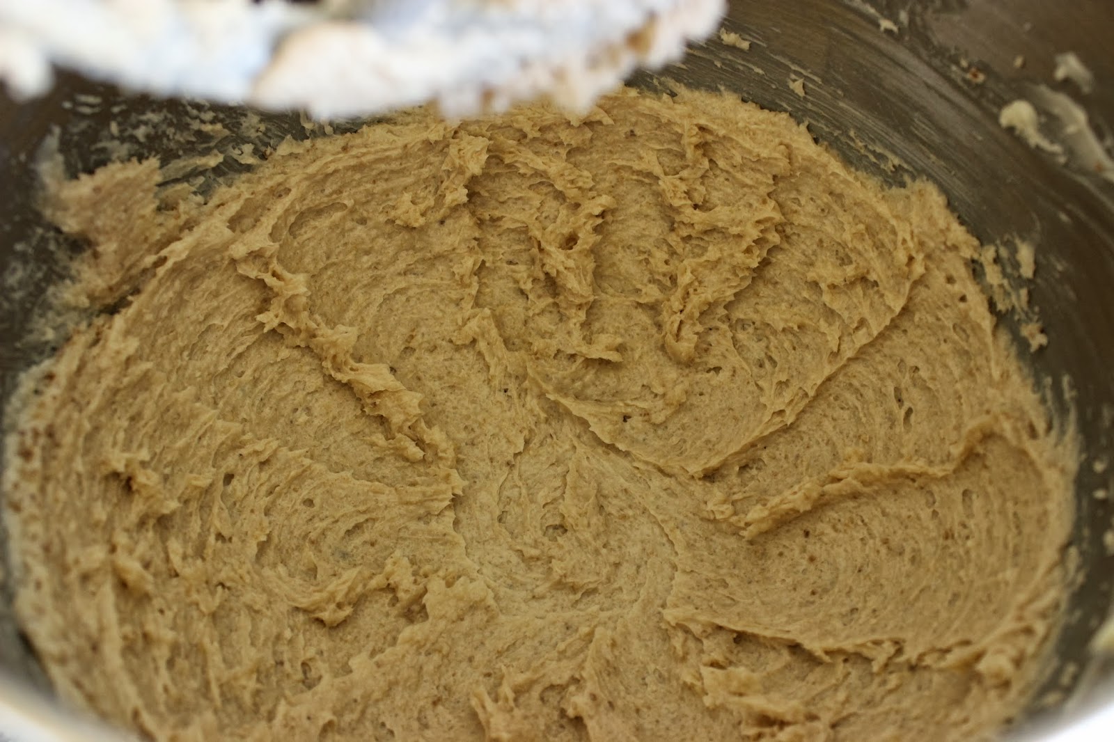 4. עוברים לעוגיות: מניחים חמאה ושני סוגי סוכר בקערת המיקסר. מחברים וו גיטרה ומקרימים על מהירות בינונית-גבוהה למשך שלוש-חמש דקות, עד לקבלת קרם חלק יחסית (הסוכר החום לא נמס, זה בסדר).