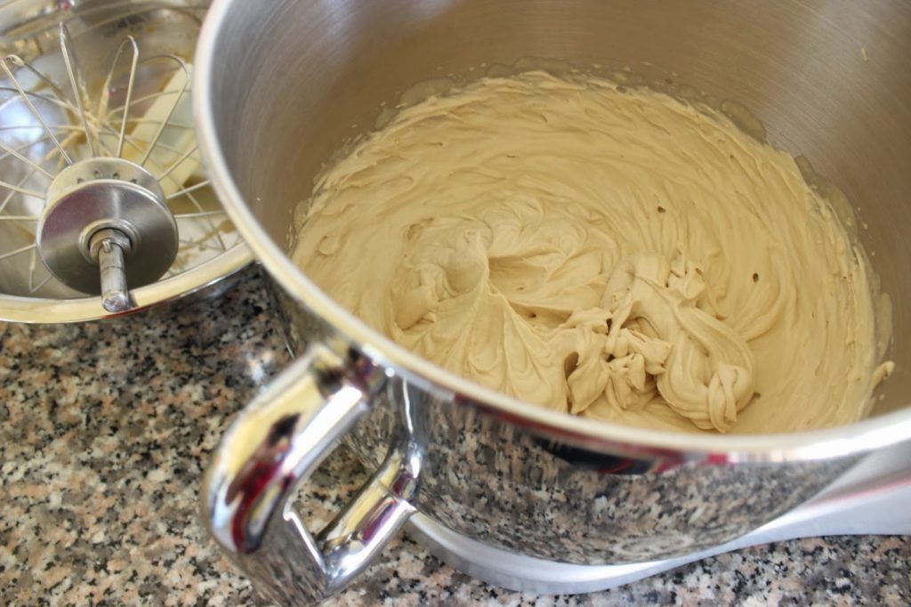 11. מסיימים את הכנת הקרם: מניחים את הגנאש הקר בקערת המיקסר יחד עם מיכל השמנת הנוסף. מחברים וו בלון ומקציפים לקצפת יציבה מאד.