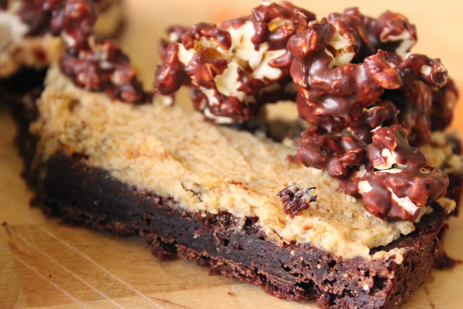 במקביל התחילו לרוץ לי כל מיני מחשבות אחרות על פופקורן ומתוקים. בעיקר התקבעתי על רעיון אחד: להכין בתבנית השקעים המלבניים שלי קינוח דו שכבתי – בסיס של פופקורן (כנראה מתוק, סביר להניח מודבק לעצמו עם קרמל או משהו, מעולם לא נכנסתי לפרטים) ומעליו שכבת בראוניז. או סתם שכבה שוקולדית דחוסה, טראפלית.