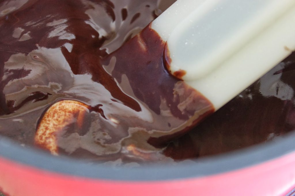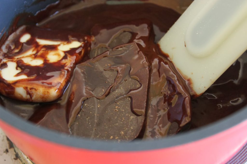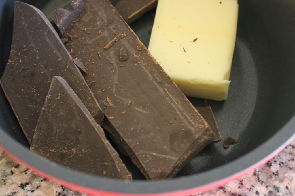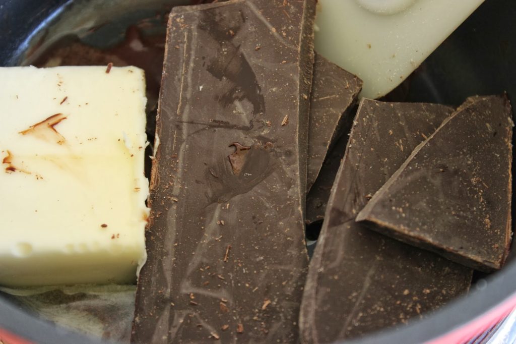 6. מניחים חמאה ושוקולד בסיר בינוני. מניחים על אש נמוכה-בינונית וממיסים, תוך כדי ערבוב. מסירים מהאש ומניחים בצד לשתיים-שלוש דקות.