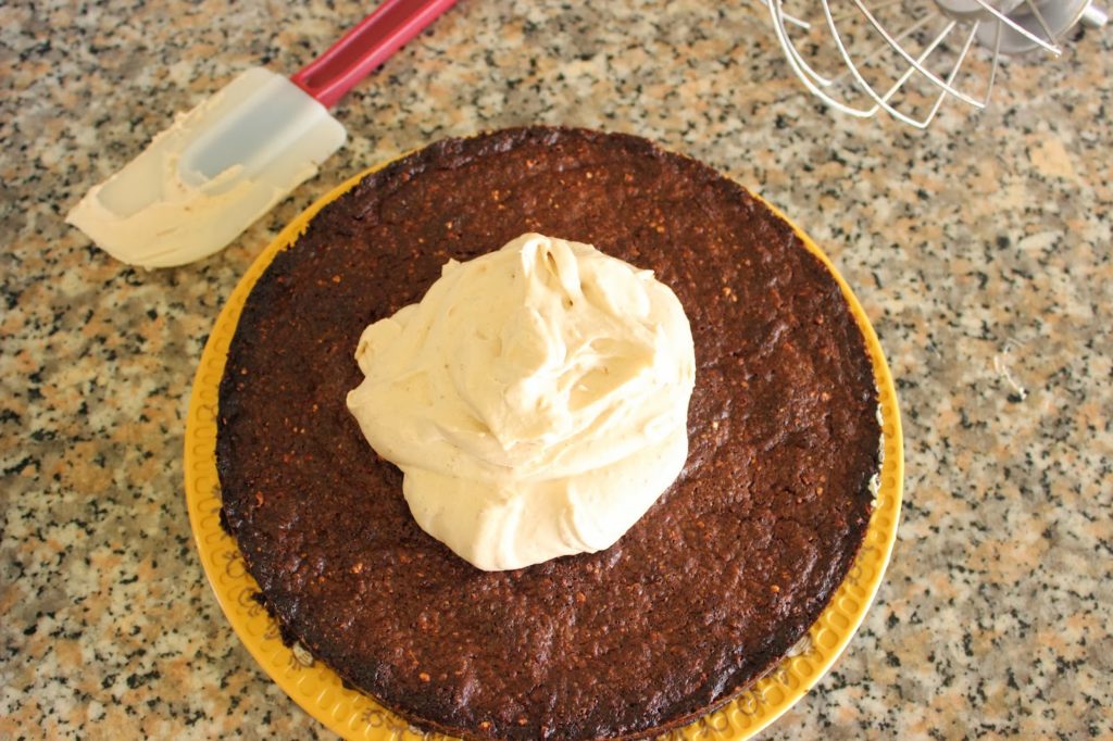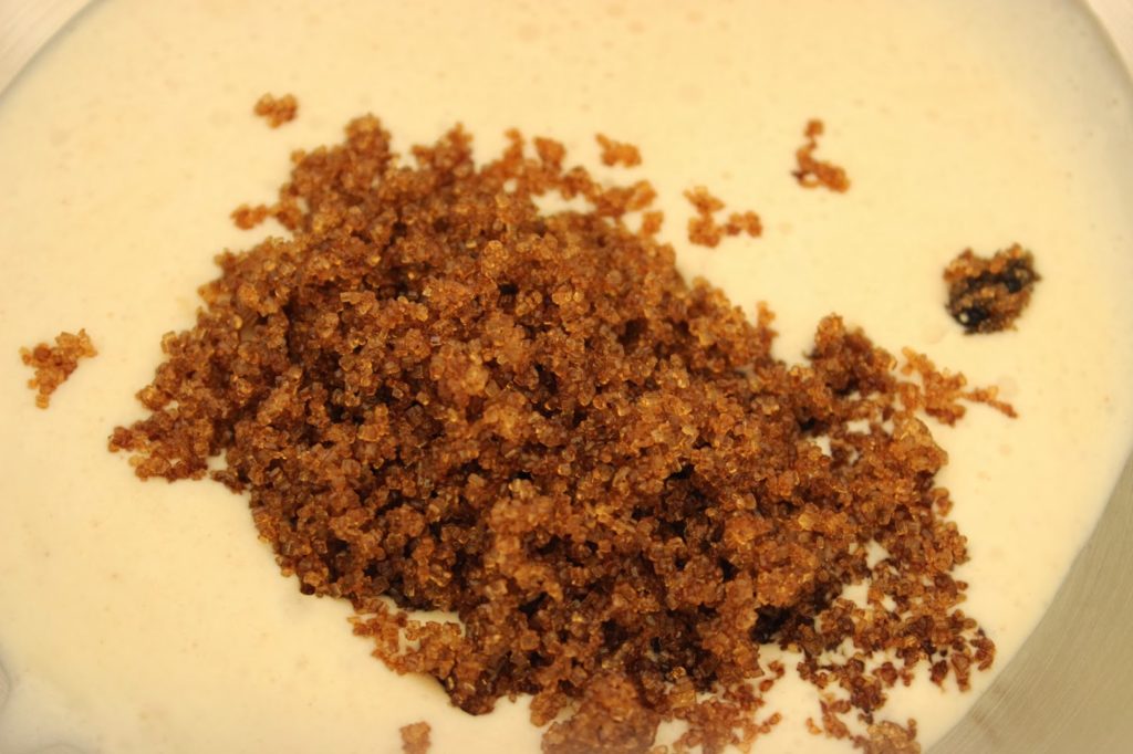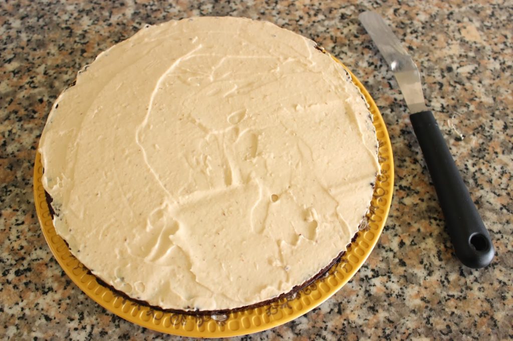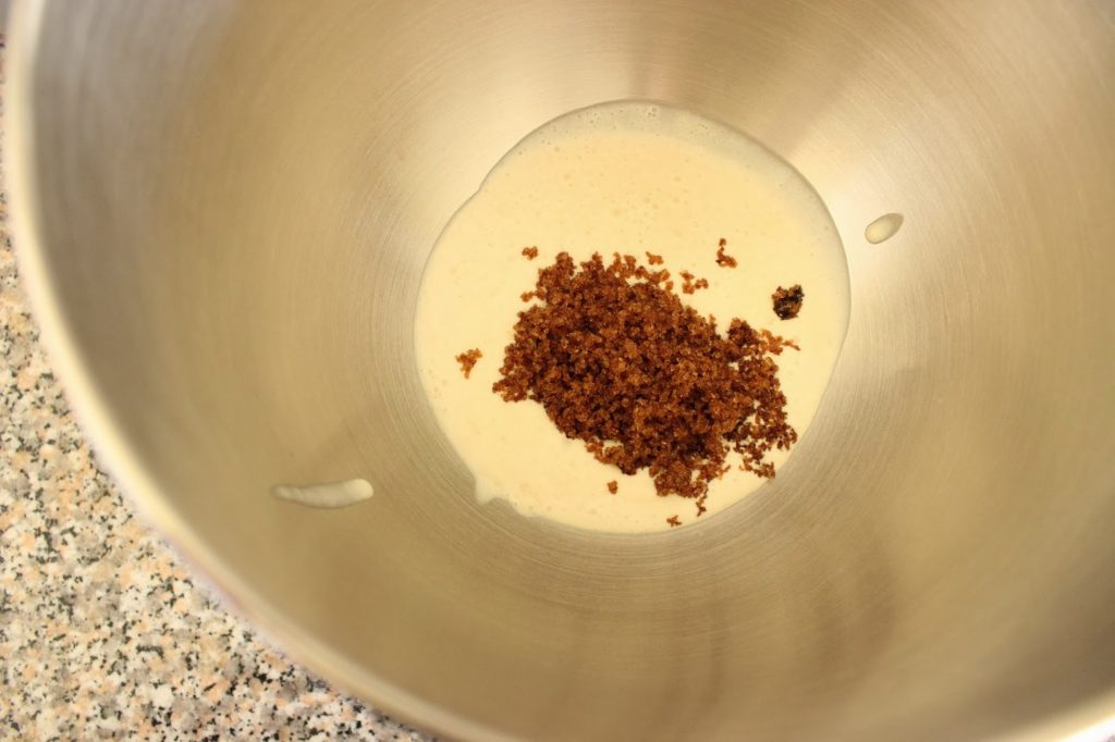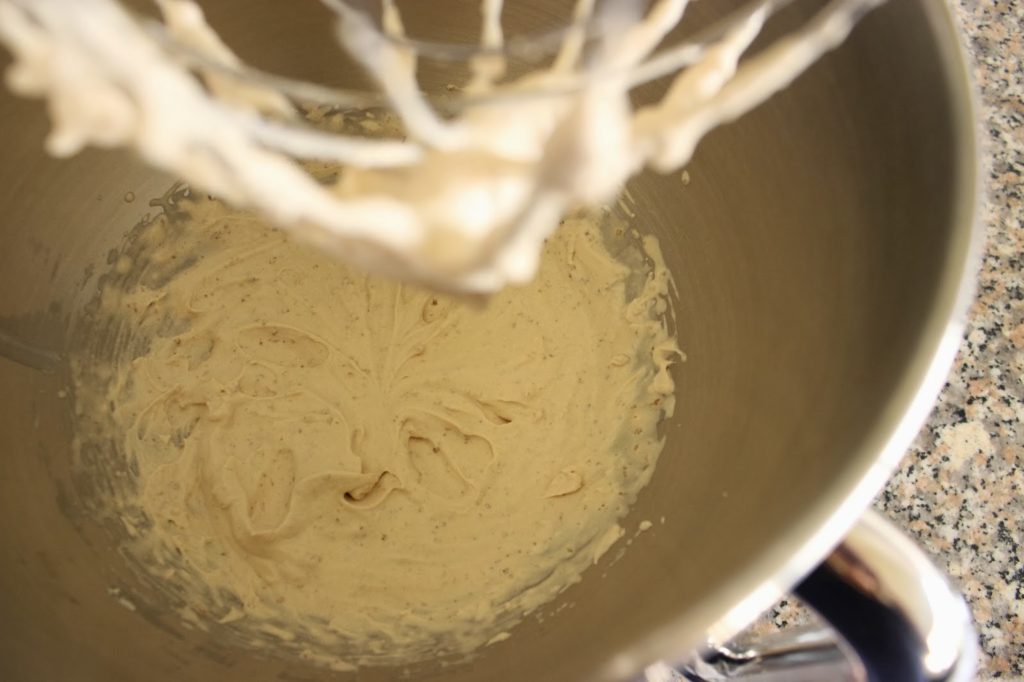 14. מוסיפים סוכר חום לשמנת, מחברים וו גיטרה ומקציפים לשמנת יציבה יחסית, אך לא מאד – במרקם נוח למריחה.