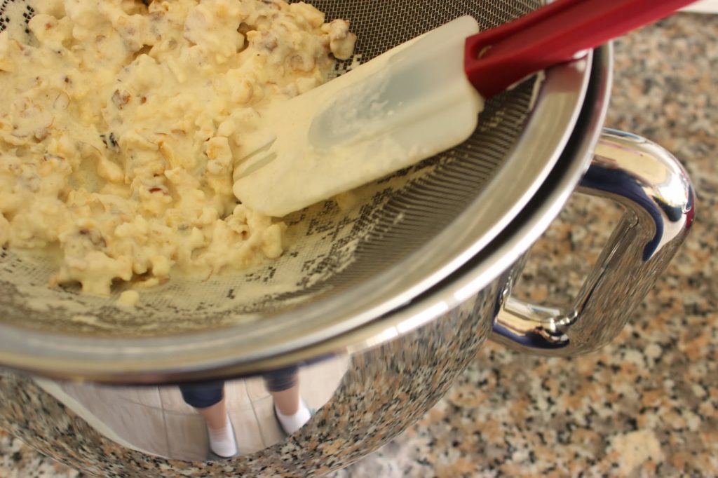 13. לאחר שהשמנת עם הפופקורן עמדה מספיק זמן במקרר, מסננים לתוך קערת המיקסר. “דוחפים” את הפופקורן לתוך המסננת בעזרת כף או לקקן, על מנת לאפשר לכמה שיותר שמנתלעבור. את הפופקורן המושרה זורקים או אוכלים (מי אכל את זה בכלל? בטח לא אני).