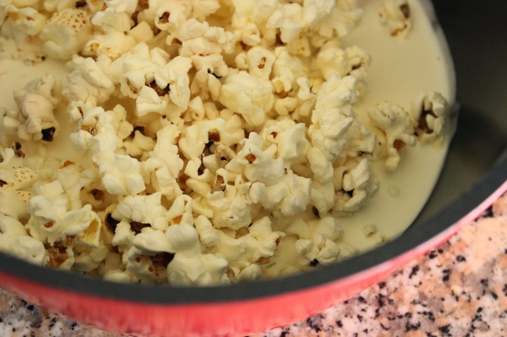 11. מוסיפים פופקורן ומבשלים תוך כדי ערבוב, עד שכל הפופקורן מצופה, משהו כמו דקה-שתיים נוספות.