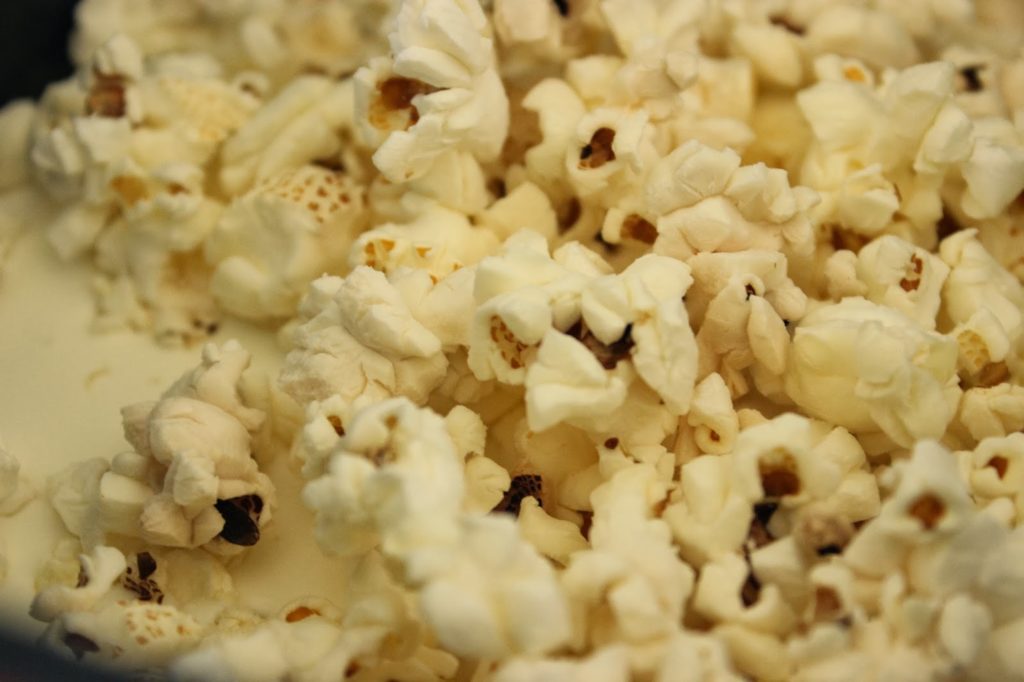 היות שהייתי חייבת לקשט איכשהו את העוגה, הכנתי עוד פופקורן. השתדלתי להתעלם מהעובדה ששרפתי אותו (לא-כל-כך-)קלות, המסתי שוקולד וציפיתי את הפופקורן.